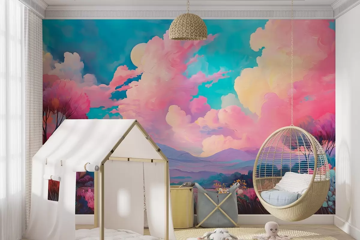 Fototapeedid Värviline maastik õlimaalide stiilis roosa taeva, taimede ja puudega Nr w09123