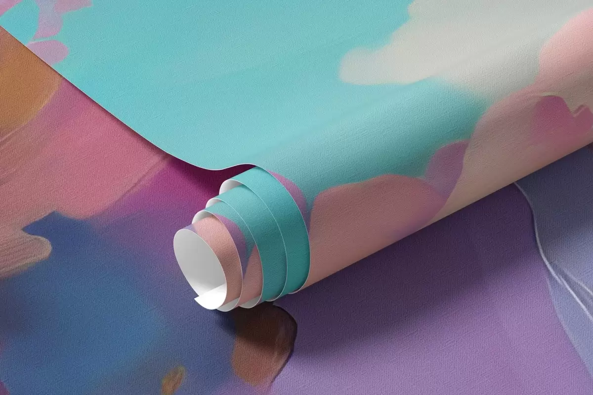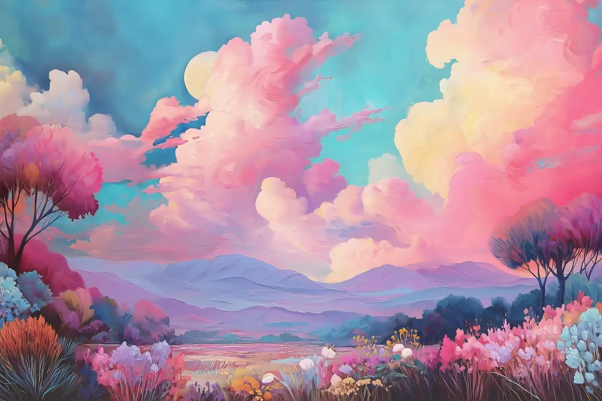 Fototapeedid Värviline maastik õlimaalide stiilis roosa taeva, taimede ja puudega Nr w09123
