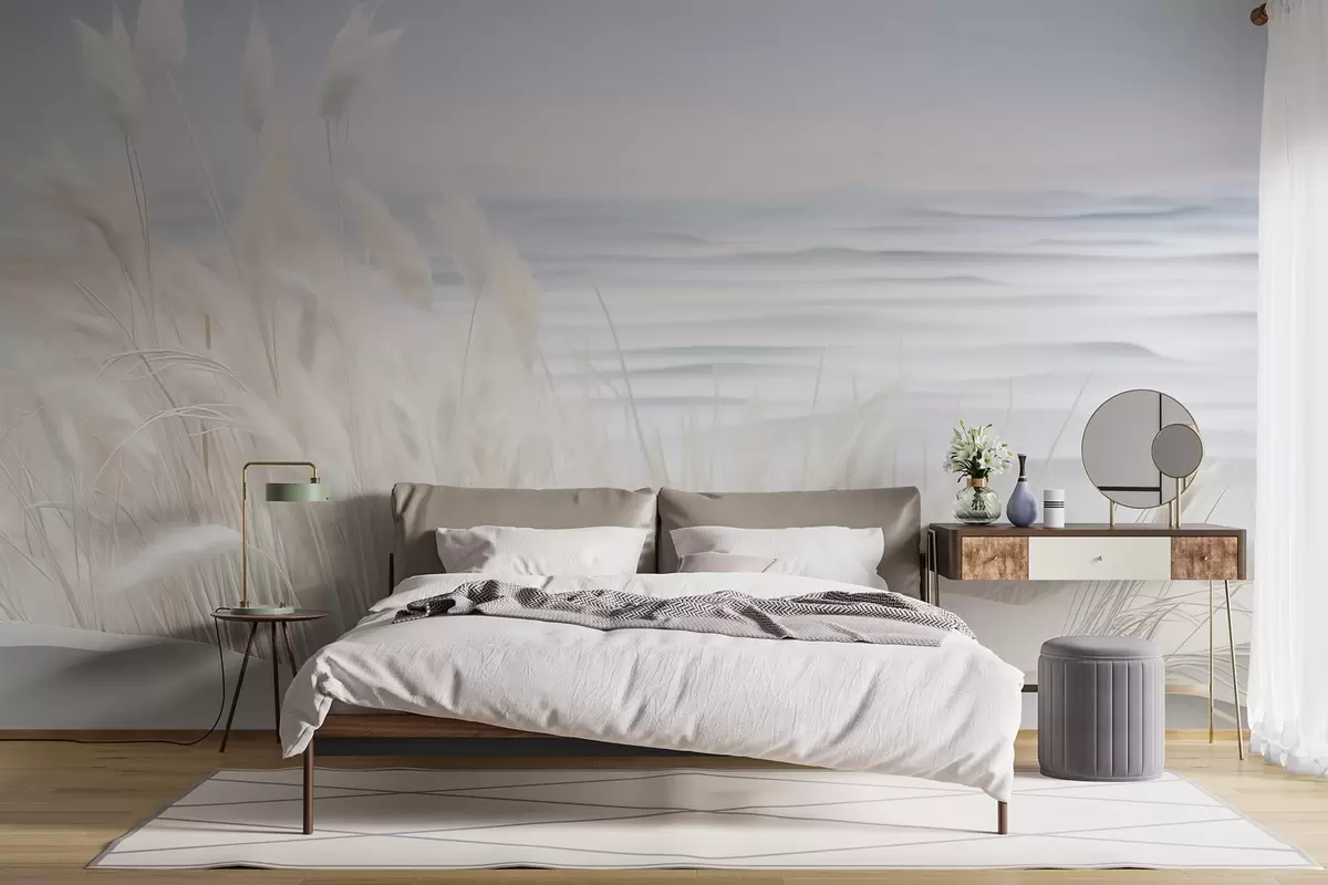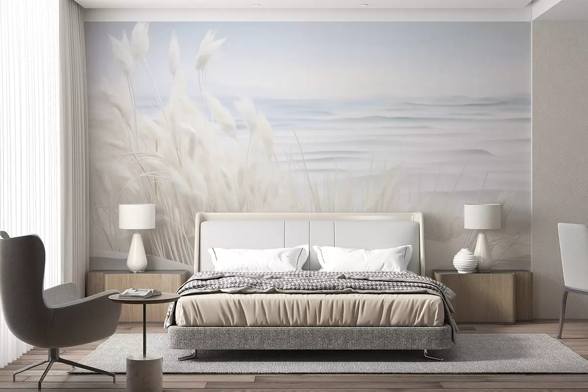 Fototapeedid Maastik valge pampa rohu liivadüünil, taustal helesinine ookean, pehme, minimalistlik stiil Nr w09132