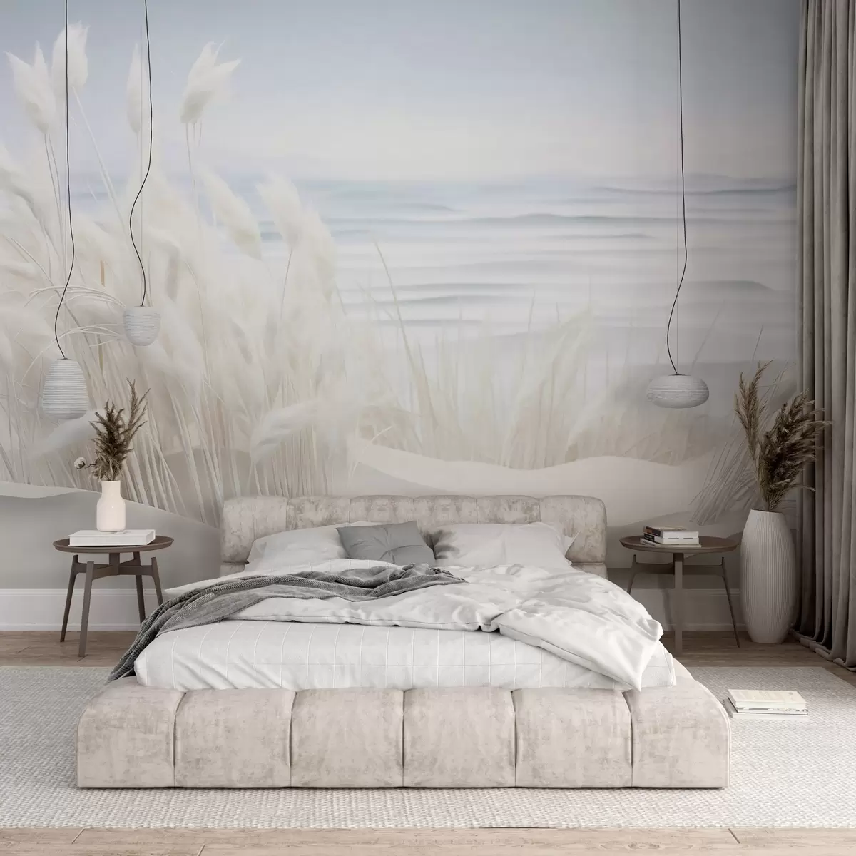 Fototapeedid Maastik valge pampa rohu liivadüünil, taustal helesinine ookean, pehme, minimalistlik stiil Nr w09132