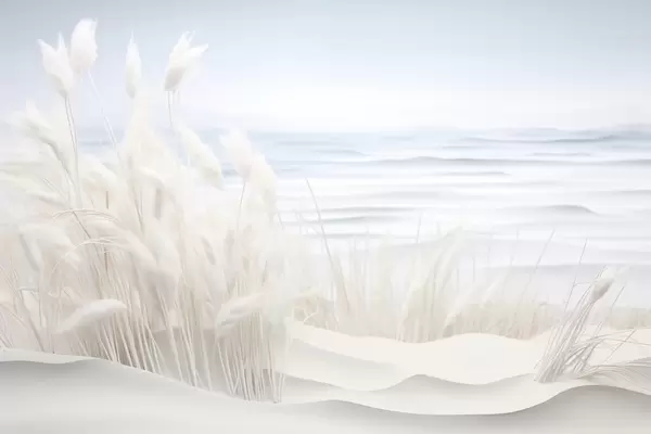 Fototapeedid Maastik valge pampa rohu liivadüünil, taustal helesinine ookean, pehme, minimalistlik stiil Nr w09132