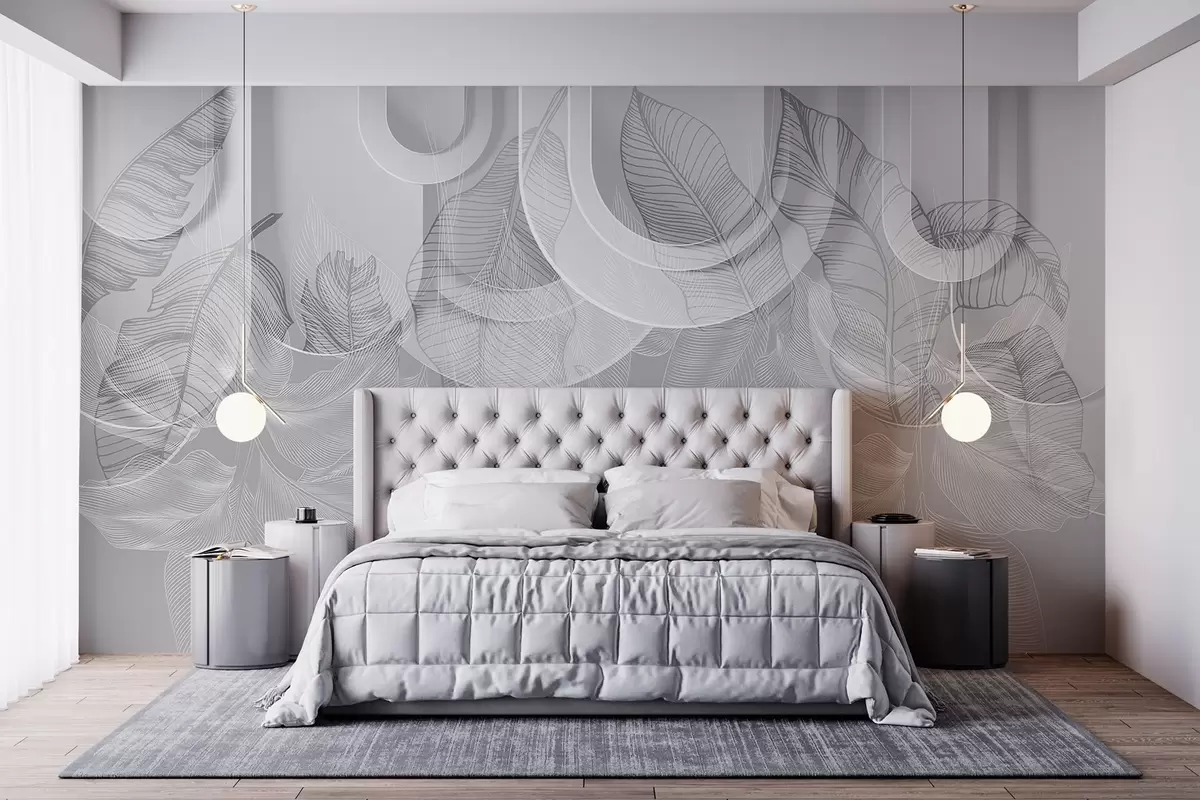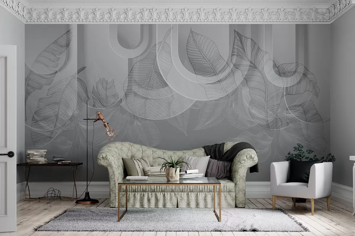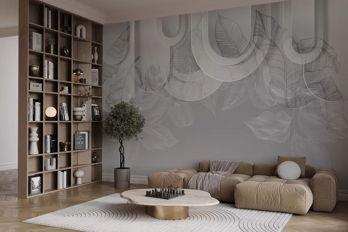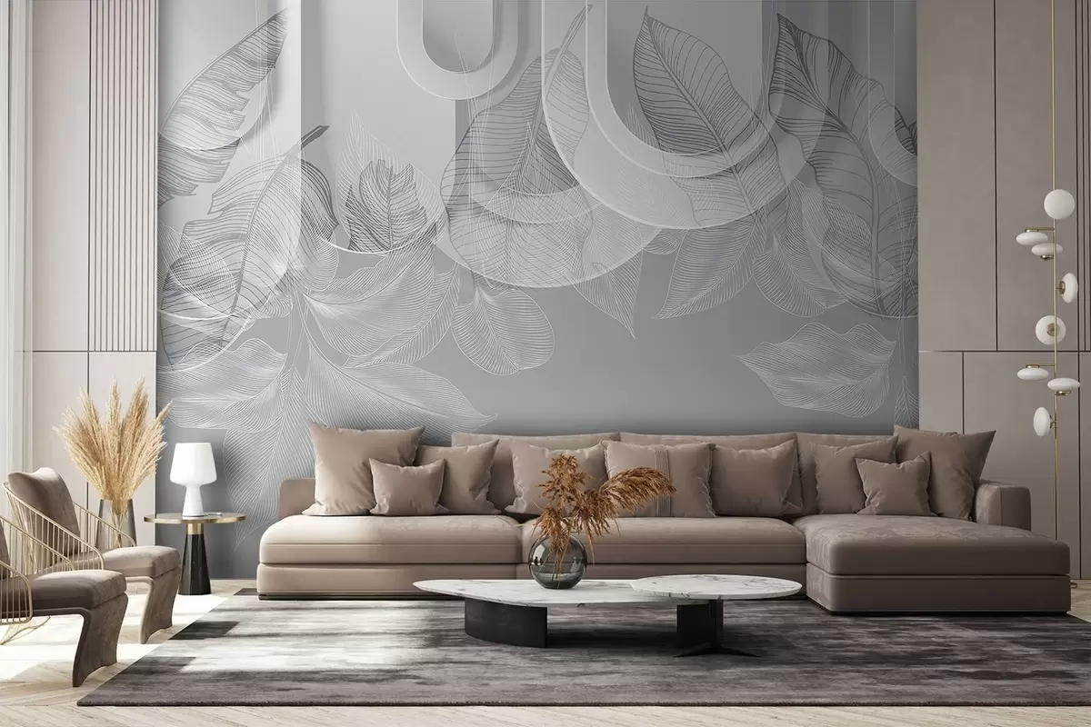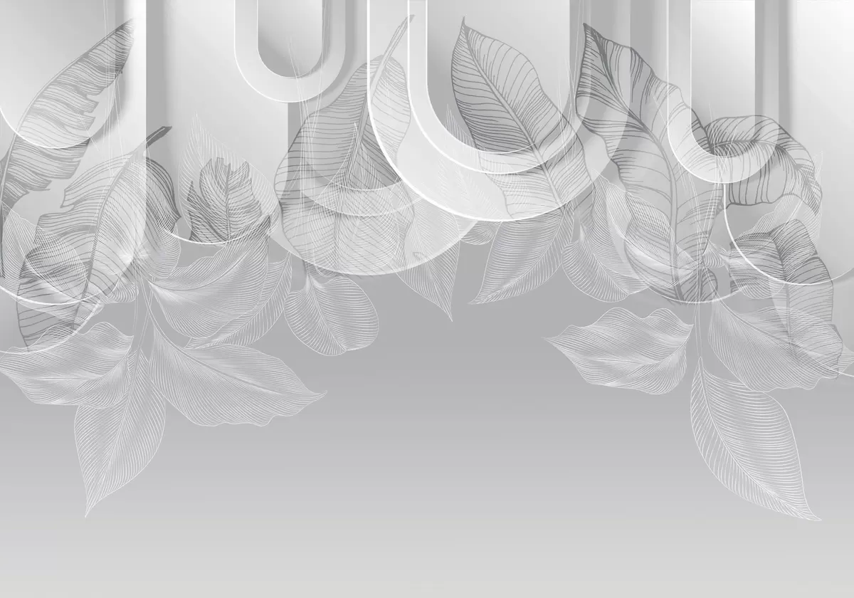 Fototapeedid Abstraktne taust halli kaarega ja valgete troopiliste lehtedega, minimalistlik disain, elegantne ja kaasaegne, neutraalne värvipalett Nr w09138