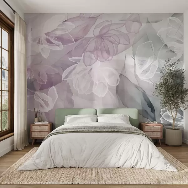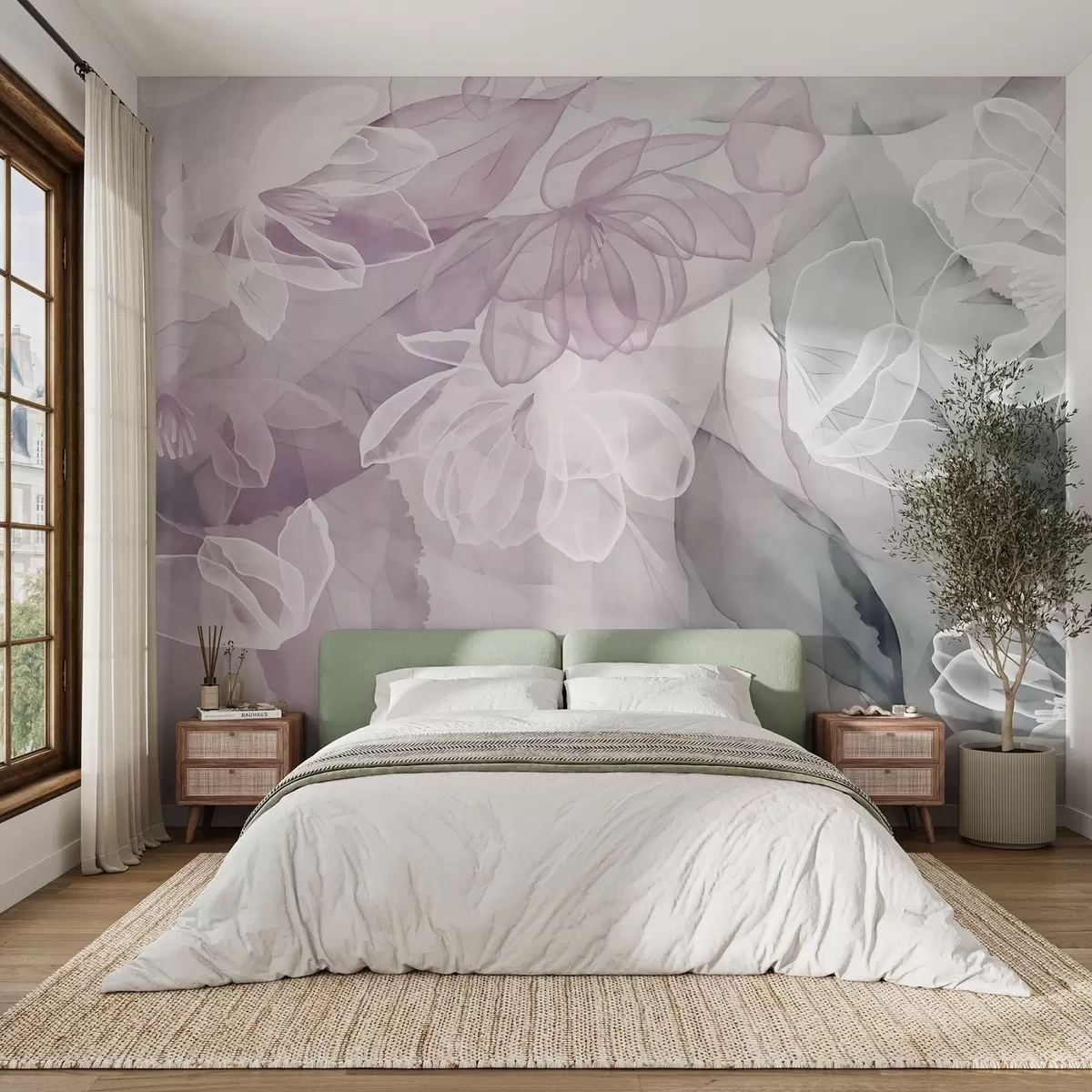 Fototapeedid Läbipaistvate kroonlehtede ja lehtedega lilled valgetes, roosades ja rohelistes toonides, pehmed ja õrnad Nr w09158v1