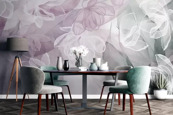 Fototapeedid Läbipaistvate kroonlehtede ja lehtedega lilled valgetes, roosades ja rohelistes toonides, pehmed ja õrnad Nr w09158v1