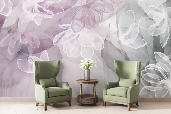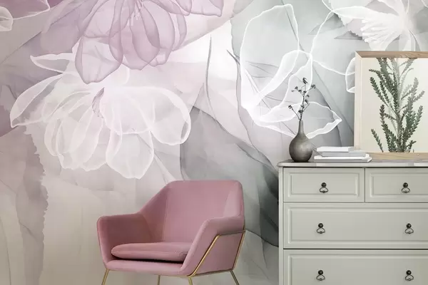 Fototapeedid Läbipaistvate kroonlehtede ja lehtedega lilled valgetes, roosades ja rohelistes toonides, pehmed ja õrnad w09158v1