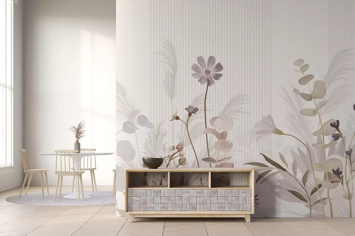 Fototapeedid Pastelsetes toonides lilled, helepruunid lehed, valge taust vertikaalsete joontega, elegantne ja minimalistlik Nr w09161