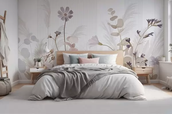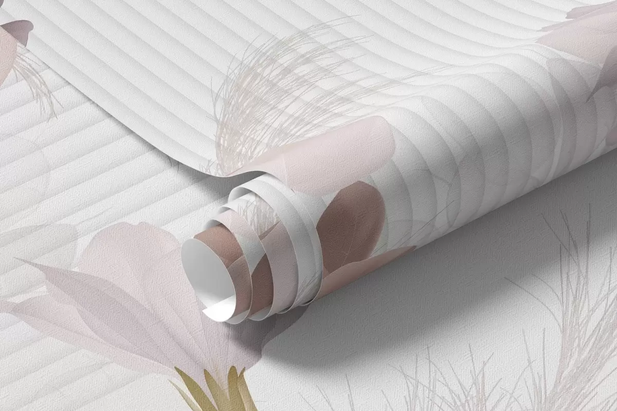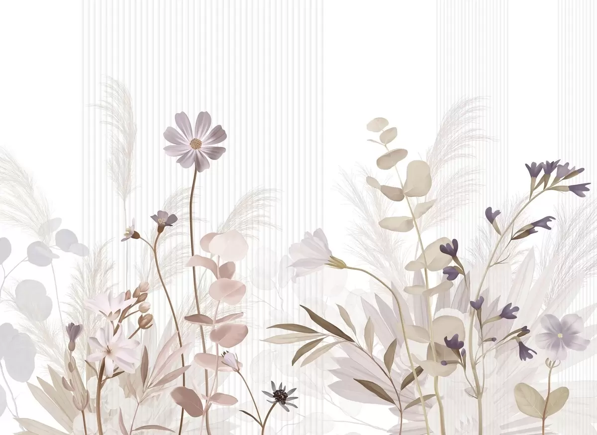 Fototapeedid Pastelsetes toonides lilled, helepruunid lehed, valge taust vertikaalsete joontega, elegantne ja minimalistlik Nr w09161