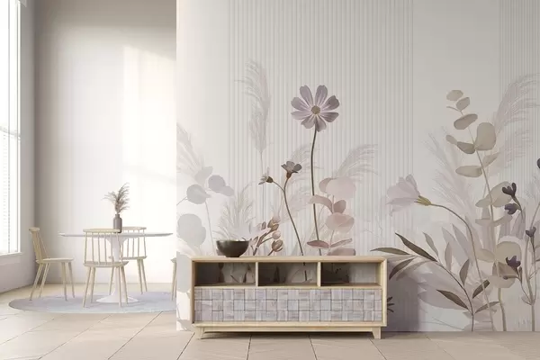 Fototapeedid Pastelsetes toonides lilled, helepruunid lehed, valge taust vertikaalsete joontega, elegantne ja minimalistlik Nr w09161