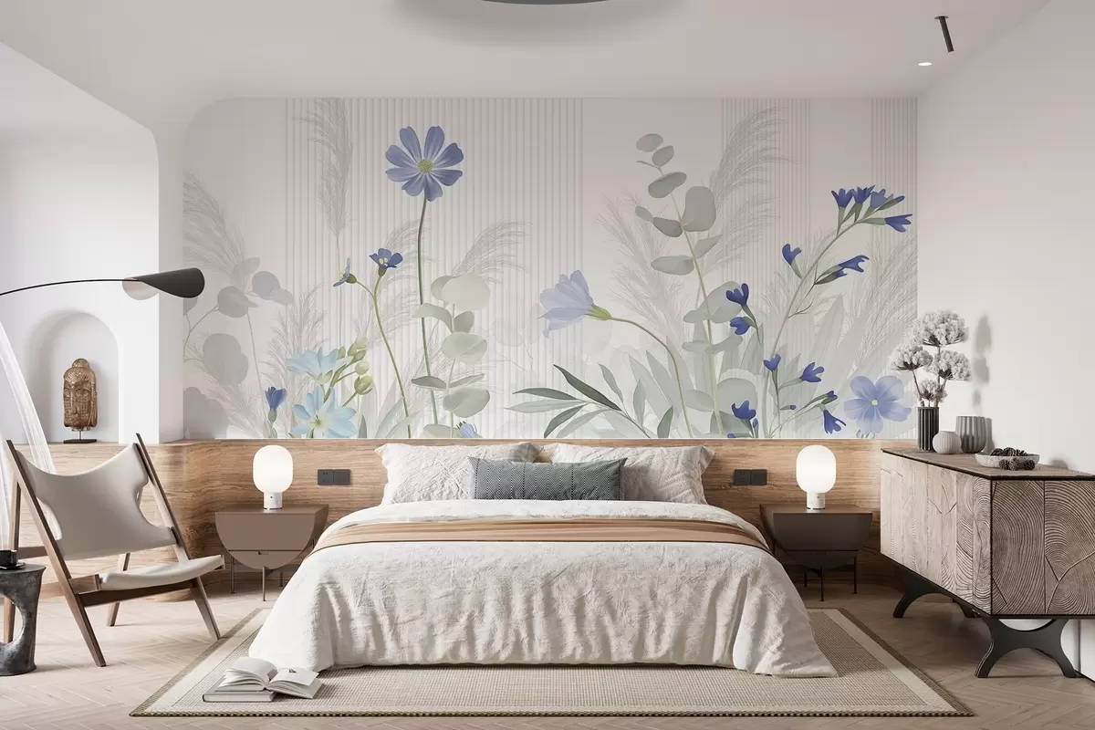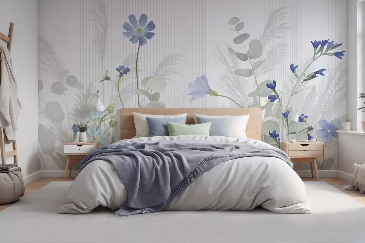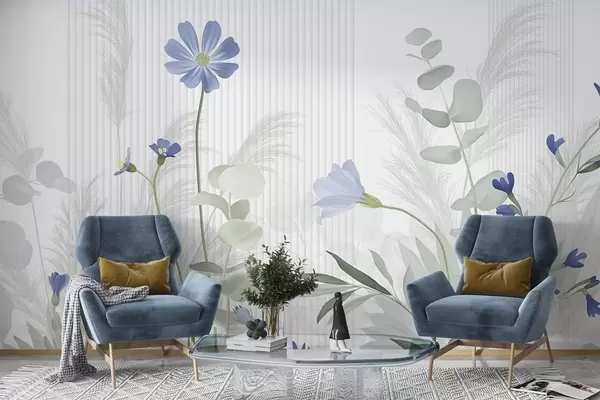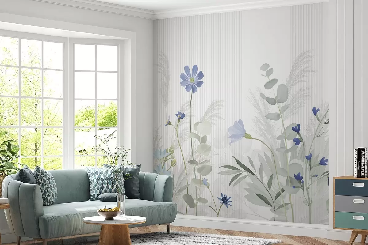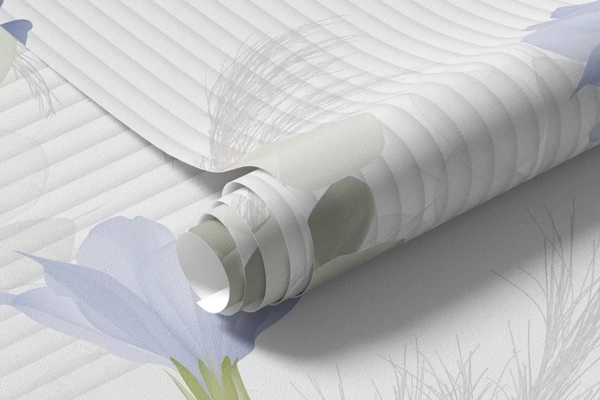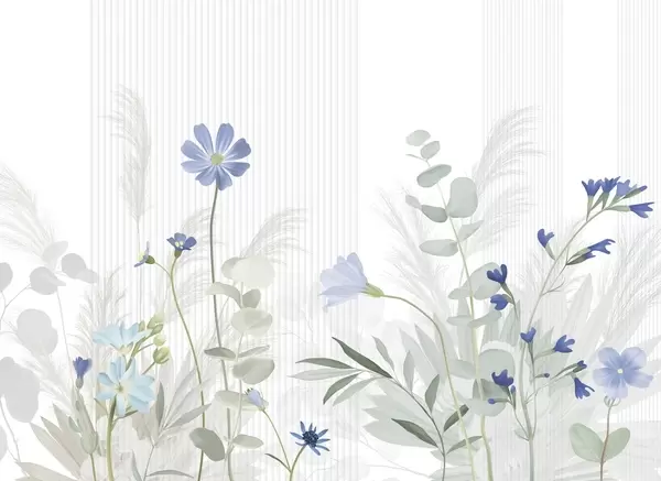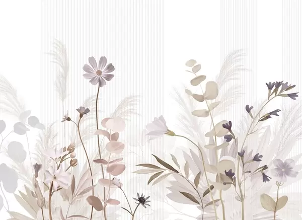 Fototapeedid Pastelsetes toonides lilled, helerohelised lehed, valge taust vertikaalsete joontega, elegantne ja minimalistlik Nr w09161v1