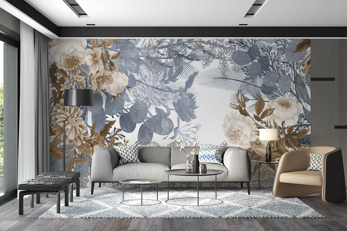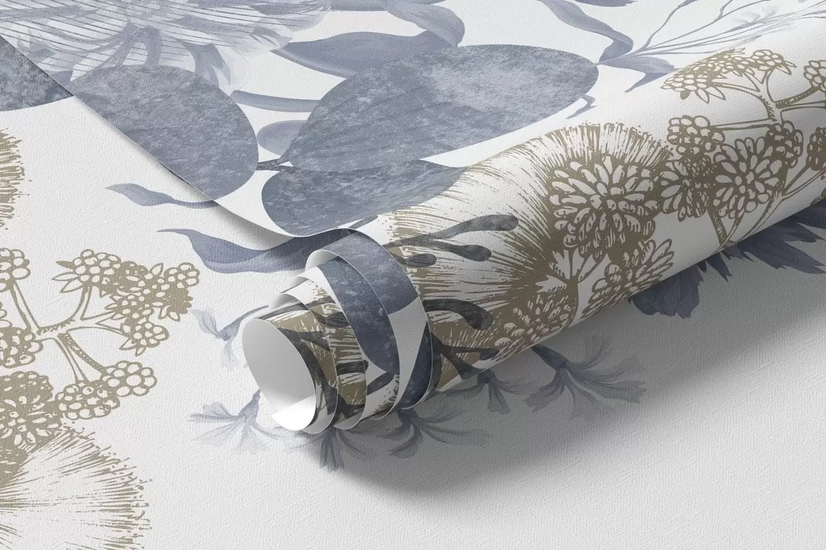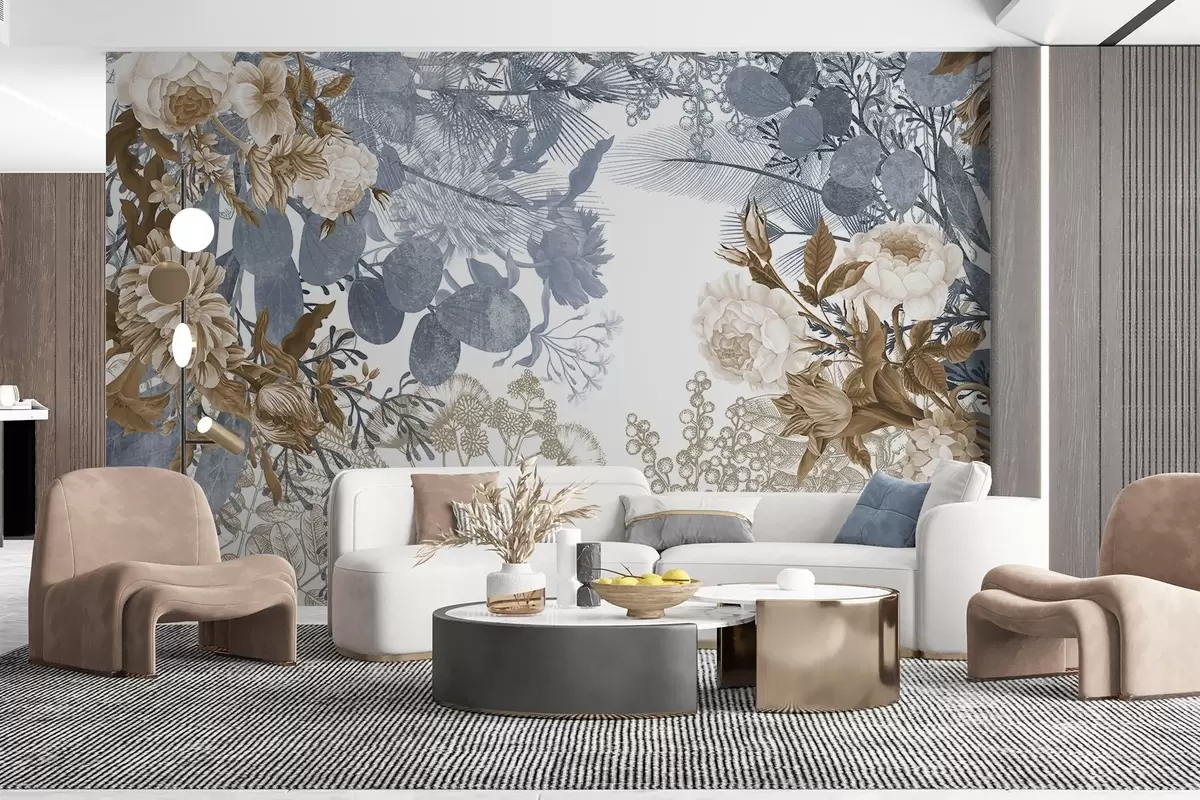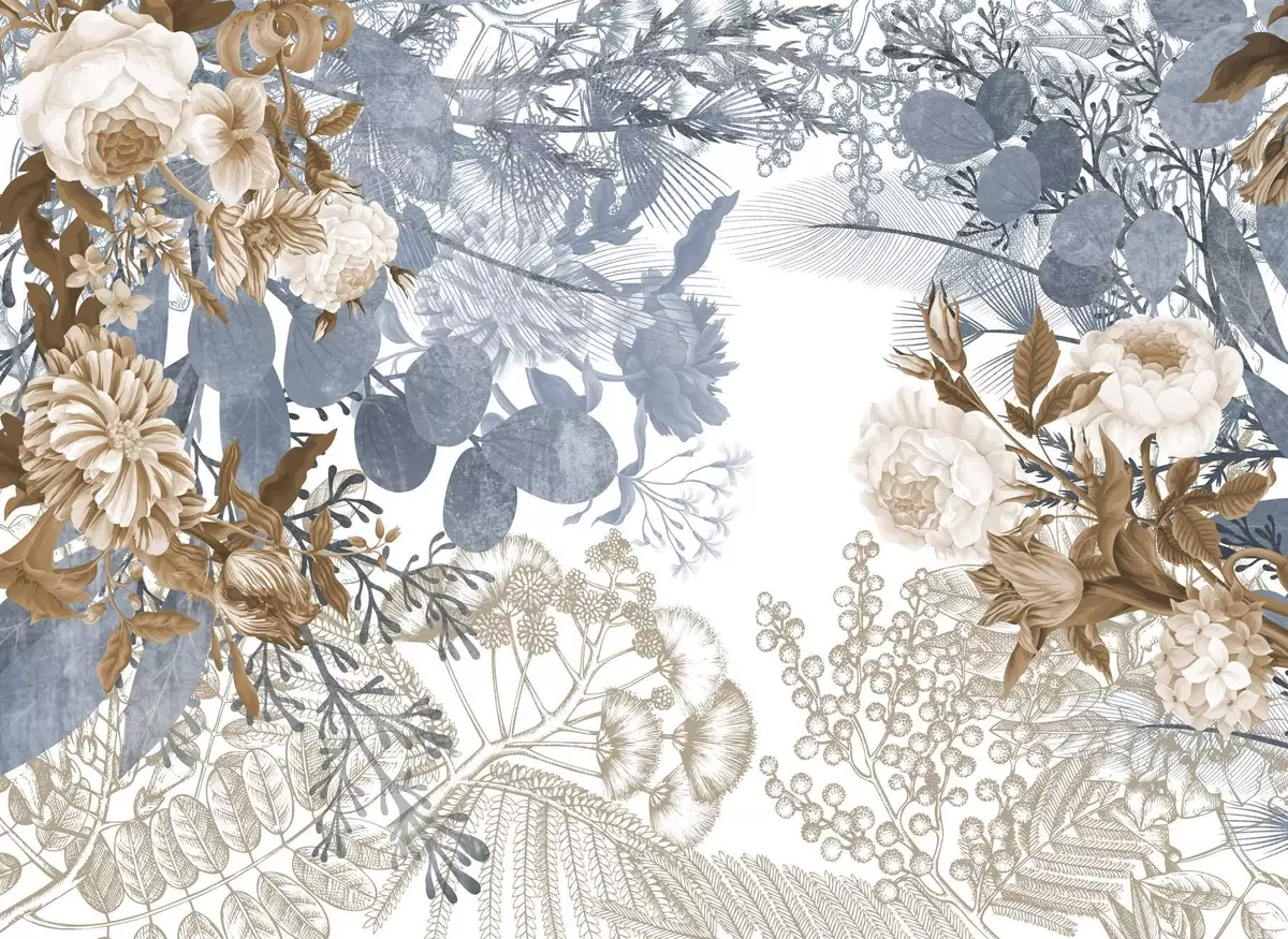 Fototapeedid Vintage lilleseade rooside, eukalüpti ja mimoosaga sinistes ja pruunides toonides Nr w09164