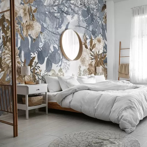 Fototapeedid Vintage lilleseade rooside, eukalüpti ja mimoosaga sinistes ja pruunides toonides Nr w09164