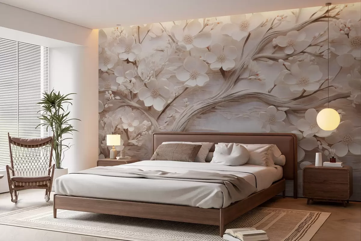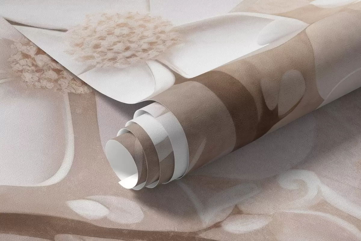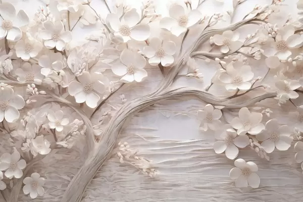 Fototapeedid Tekstuurne puu valgete lillede ja pruuni tüvega, taust on valge, horisontaalsete joontega pehme valgustus Nr w09166