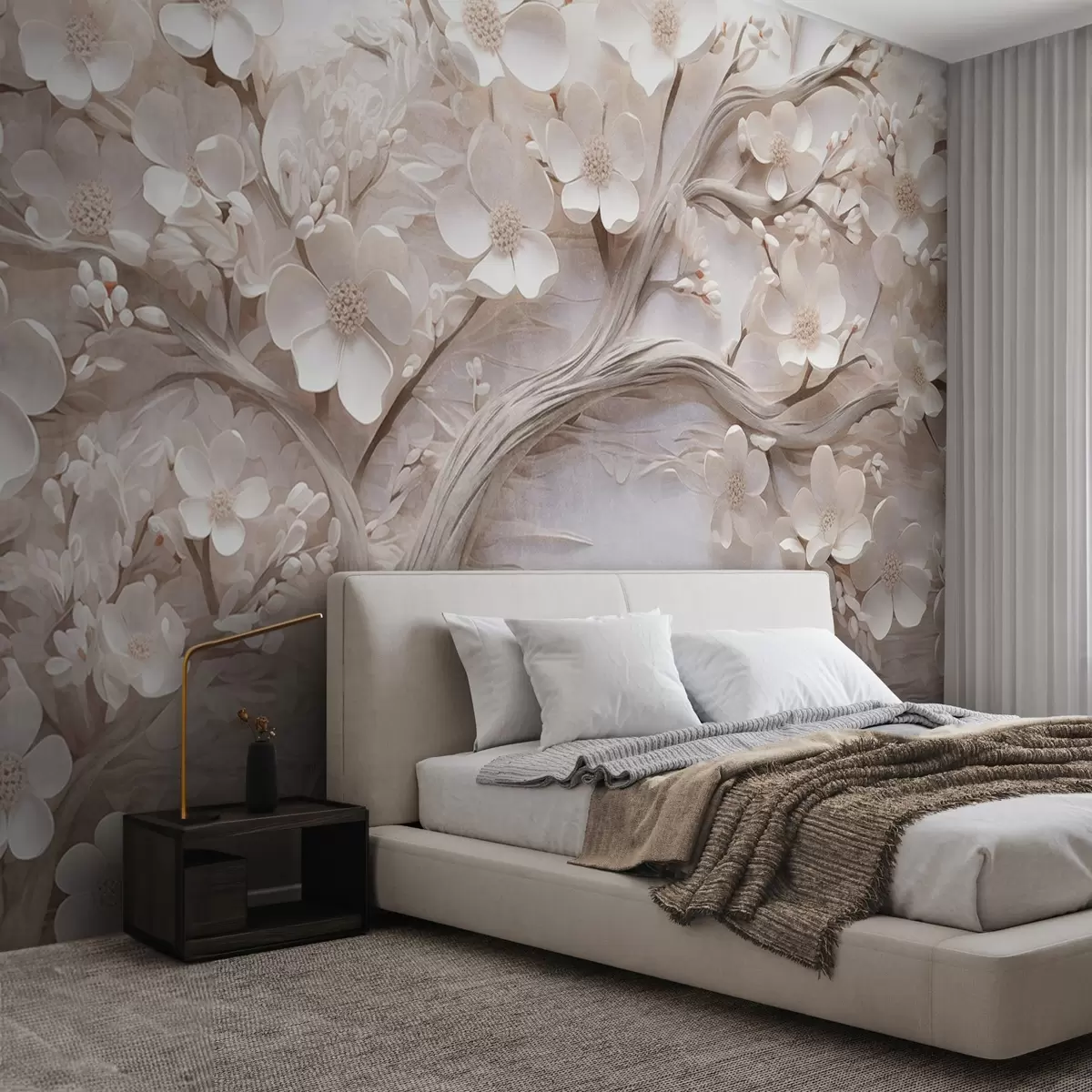 Fototapeedid Tekstuurne puu valgete lillede ja pruuni tüvega, taust on valge, horisontaalsete joontega pehme valgustus Nr w09166