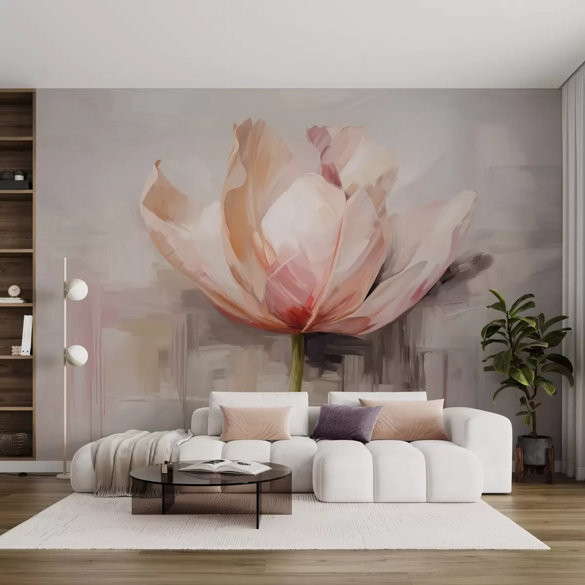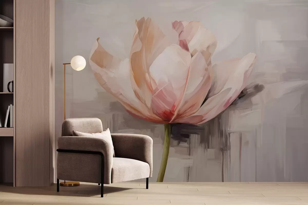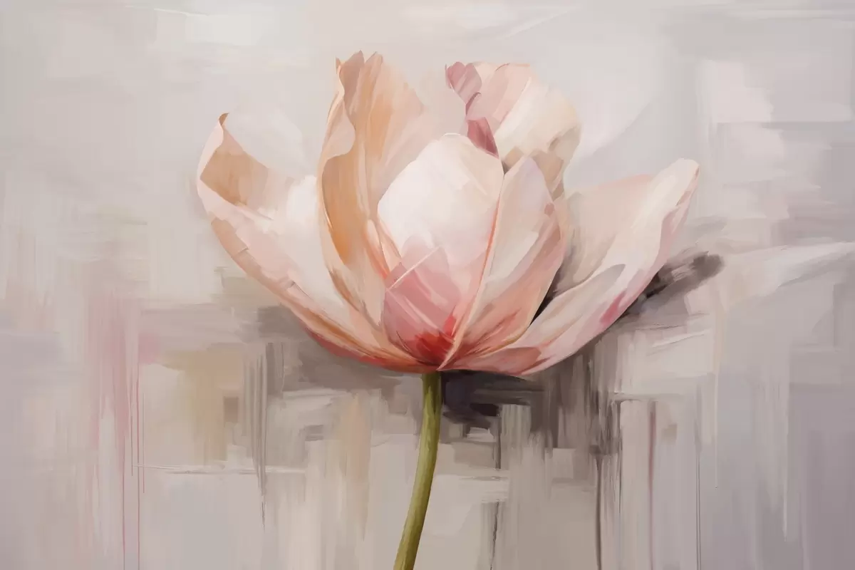 Fototapeedid Roosa tulp, õlimaalide imitatsioon pehmete pintslitõmmetega, abstraktne taust pastelsete hallide ja beežide toonidega Nr w09187