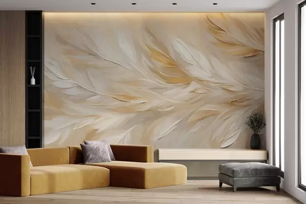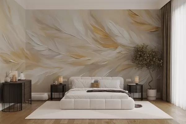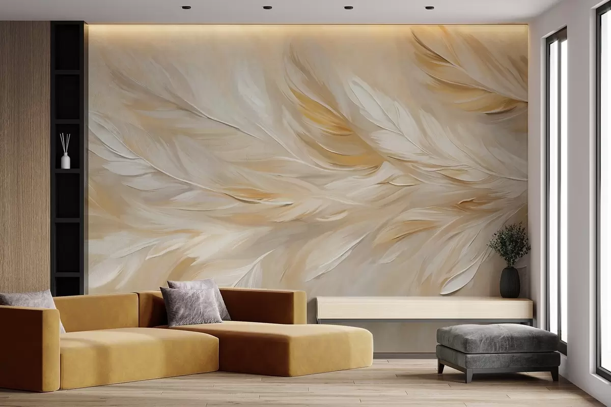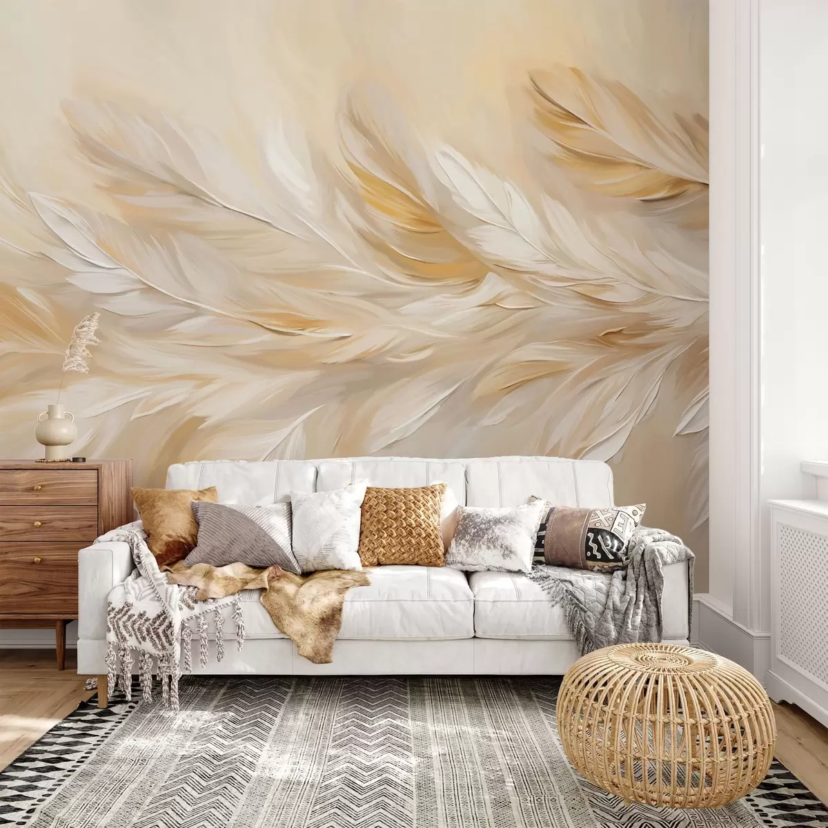 Fototapeedid Valged ja beežid suled paigutatud voolavaks trükiks, pehme tekstuur, soe värvipalett, abstraktne taust Nr w09191