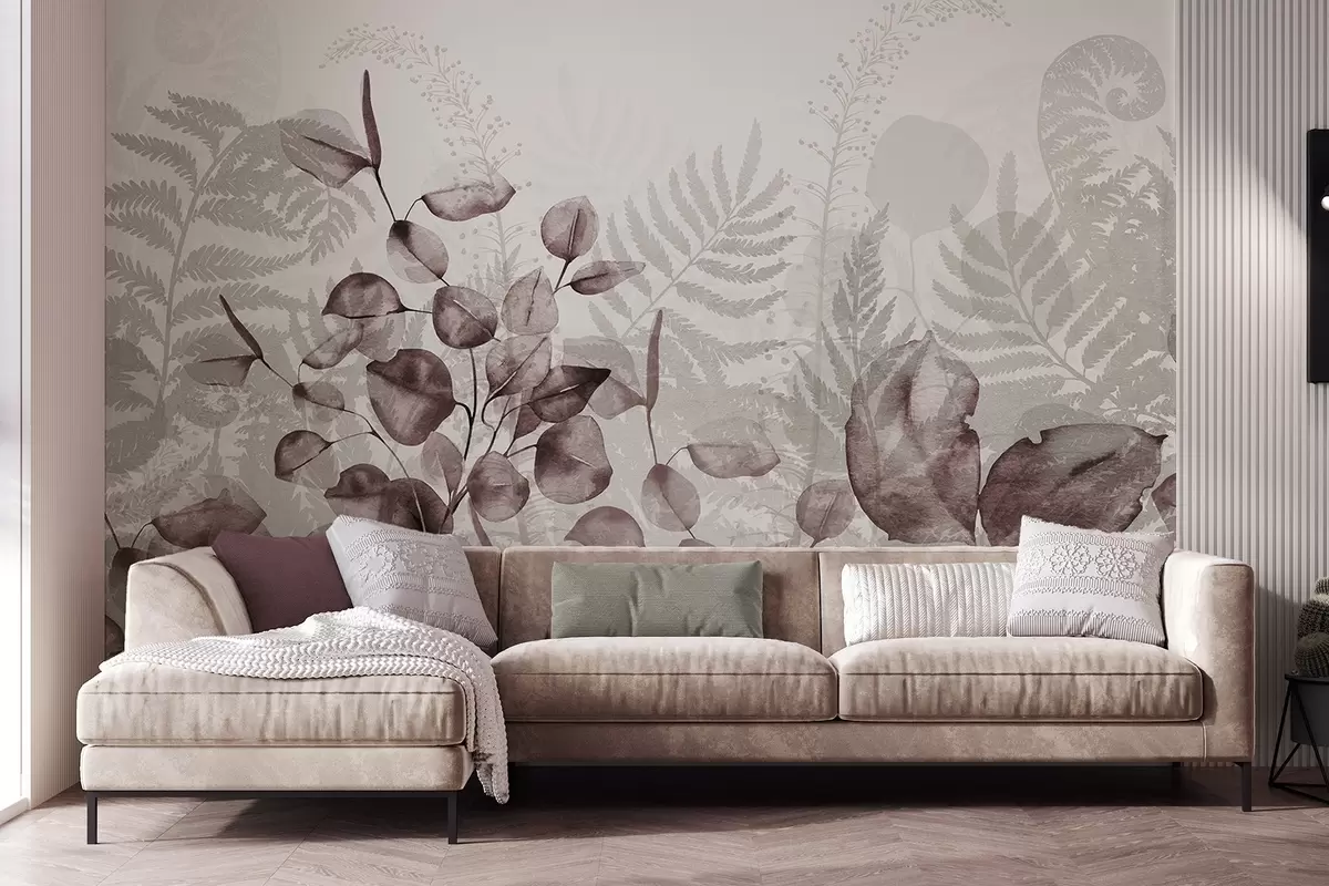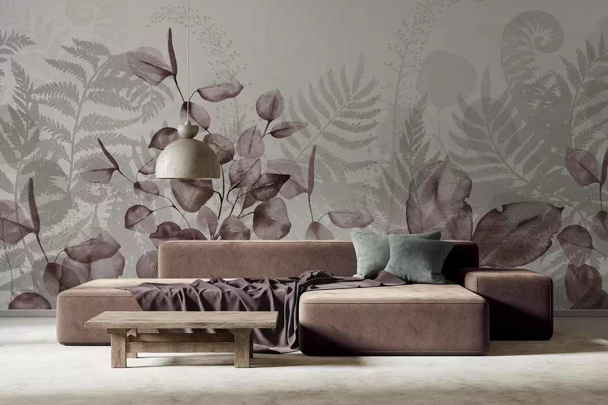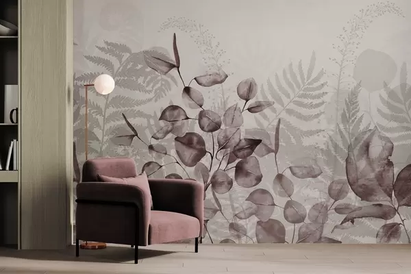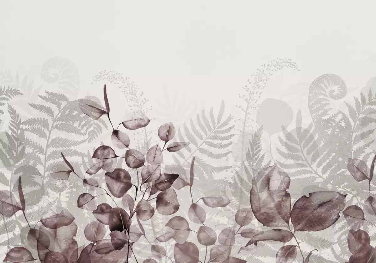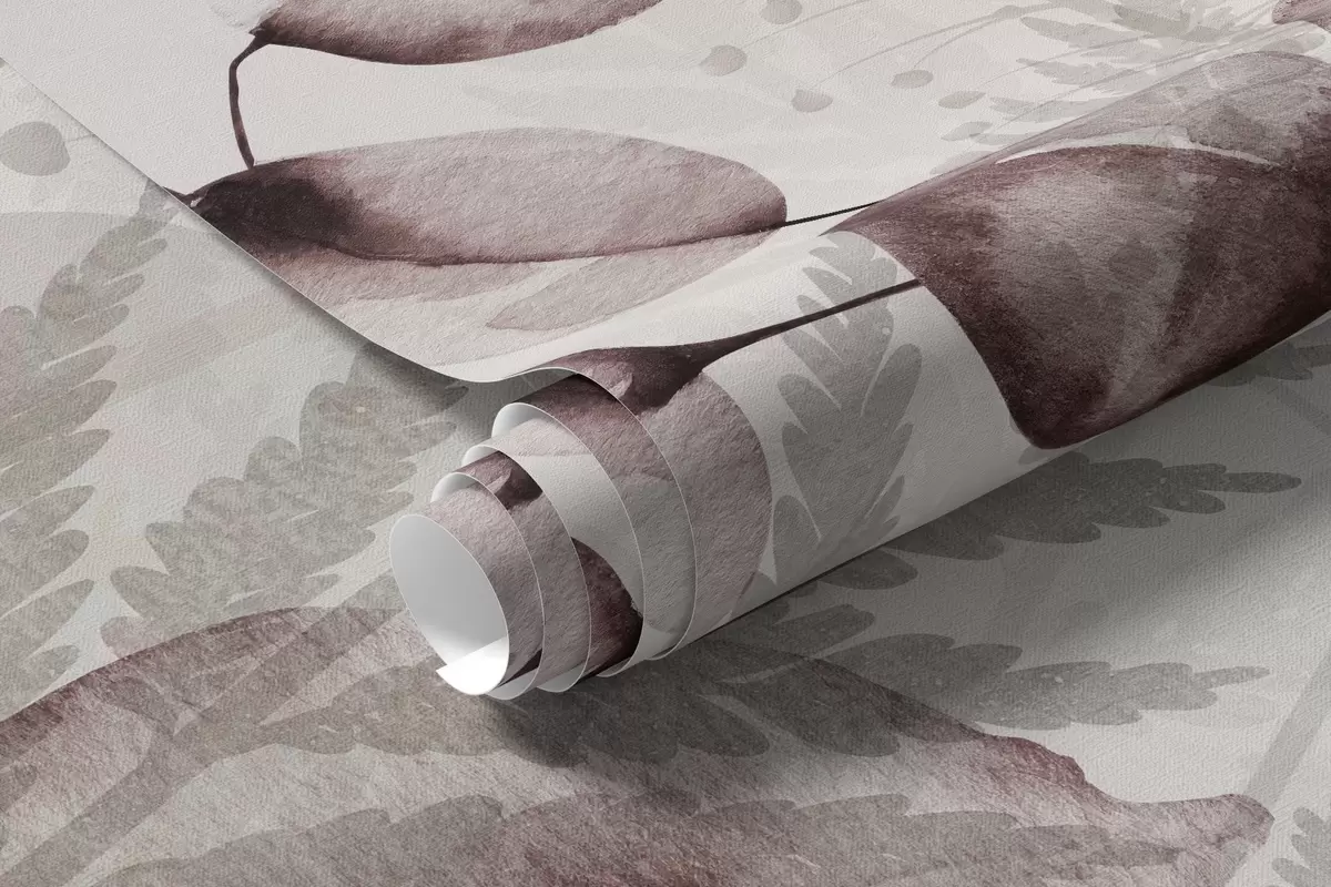 Fototapeedid Eukalüpti ja sõnajalgade lehed bordo ja halli toonides, akvarelli efekt , botaaniline illustratsioon Nr w09197v1
