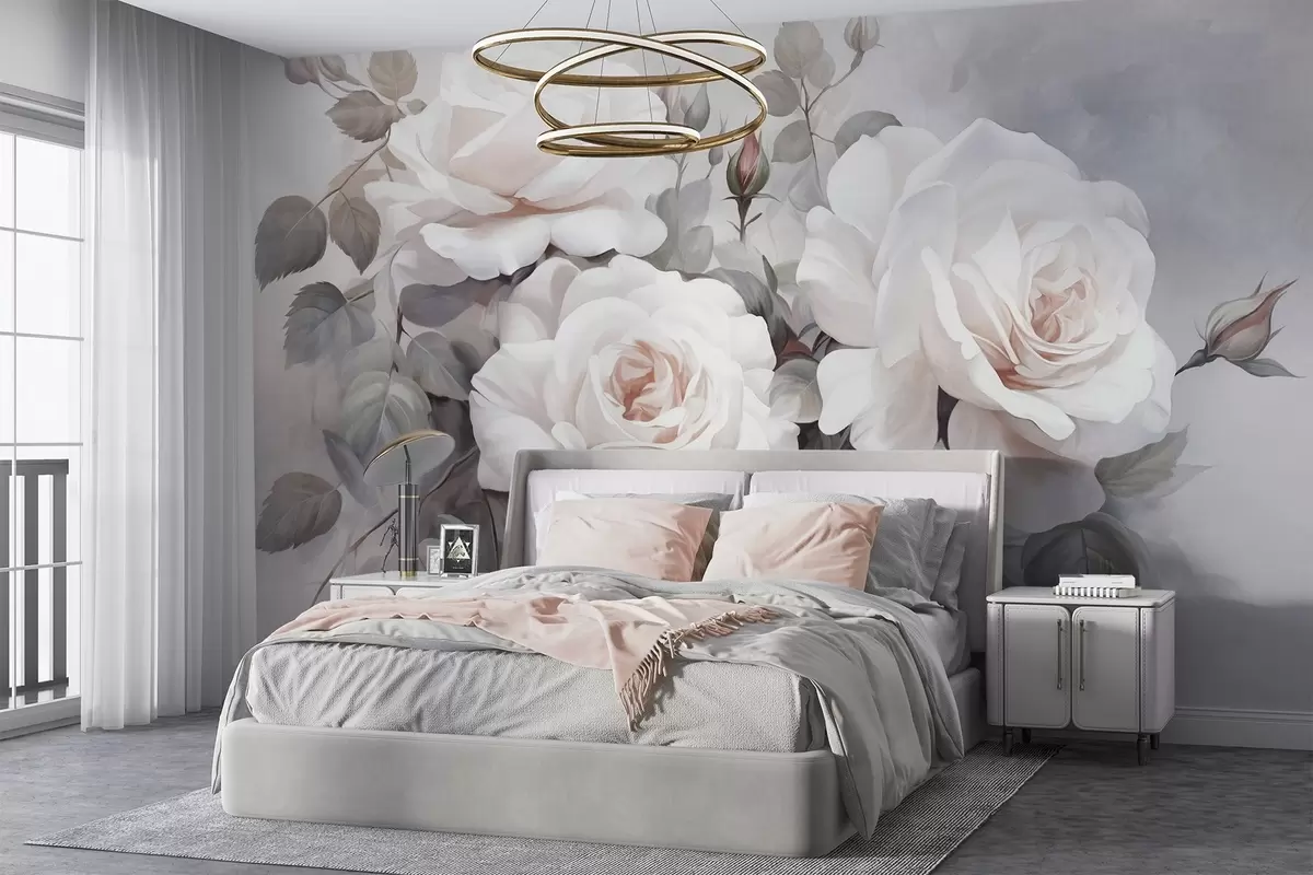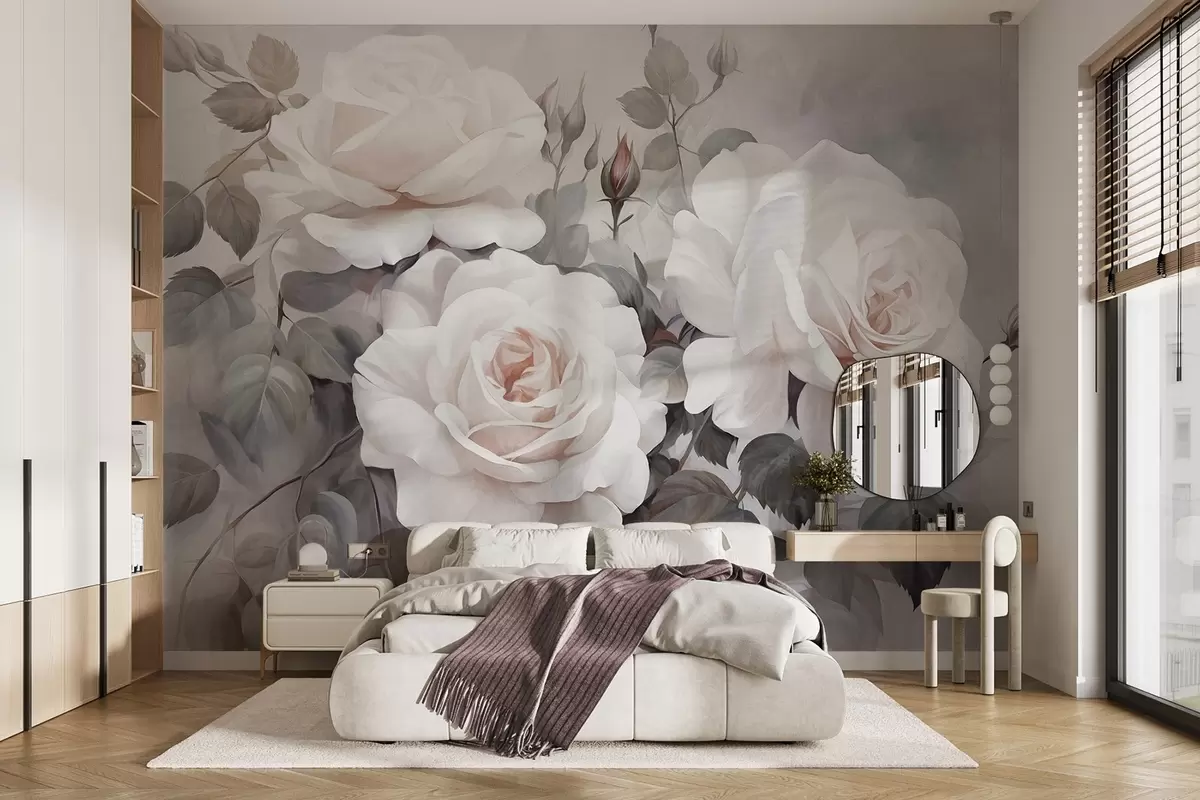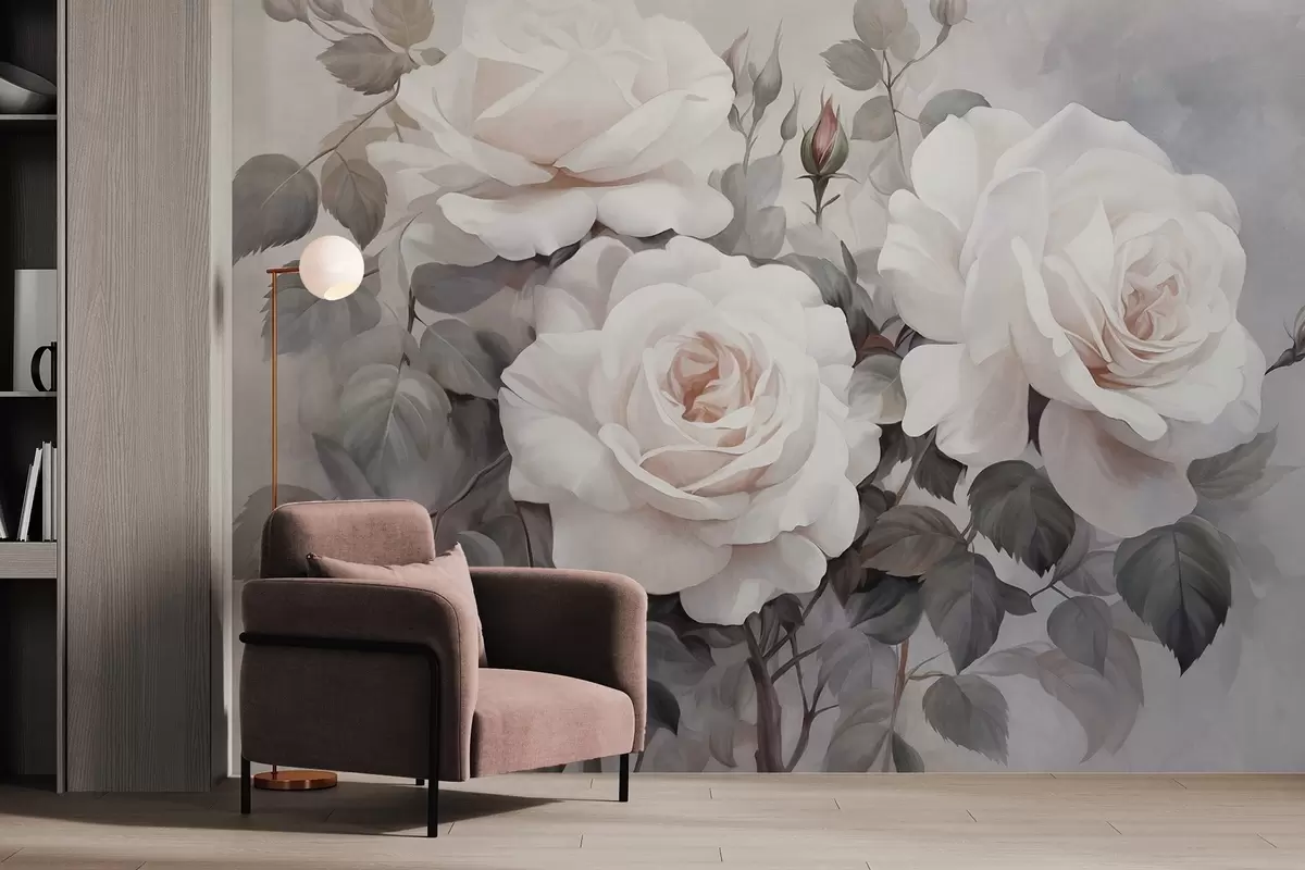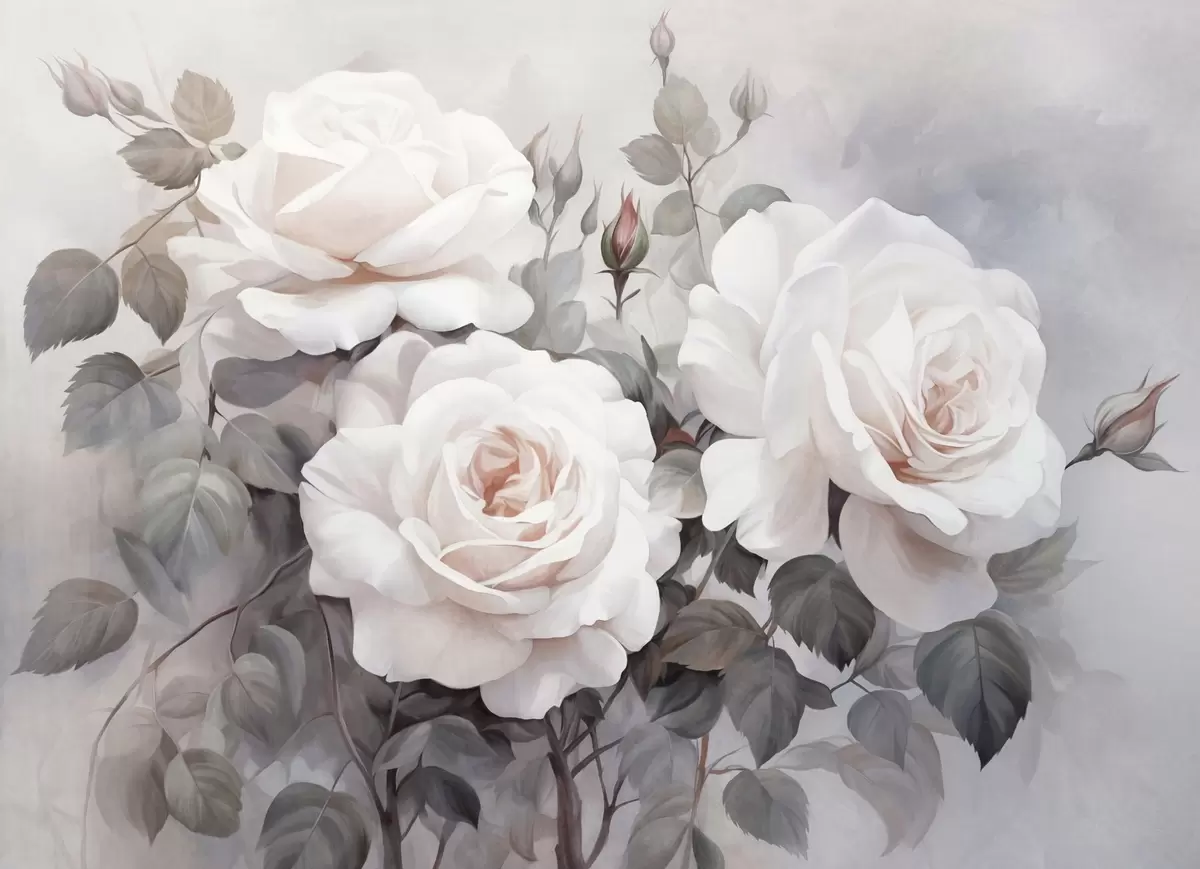 Fototapeedid Tekstuursed valged roosid lehtede ja varrega, pehmed vaoshoitud pastelsed värvid, elegantne vintage stiil, õrnad pintslitõmbed Nr w09198