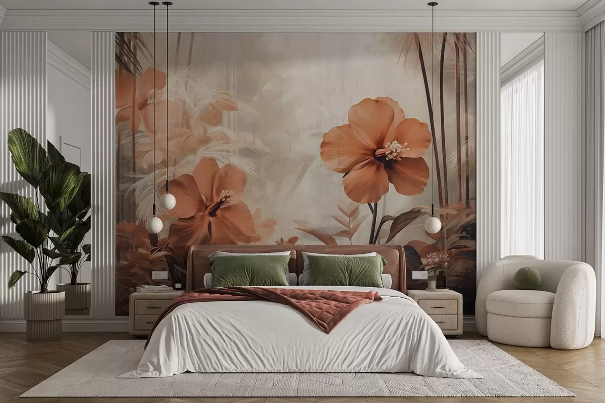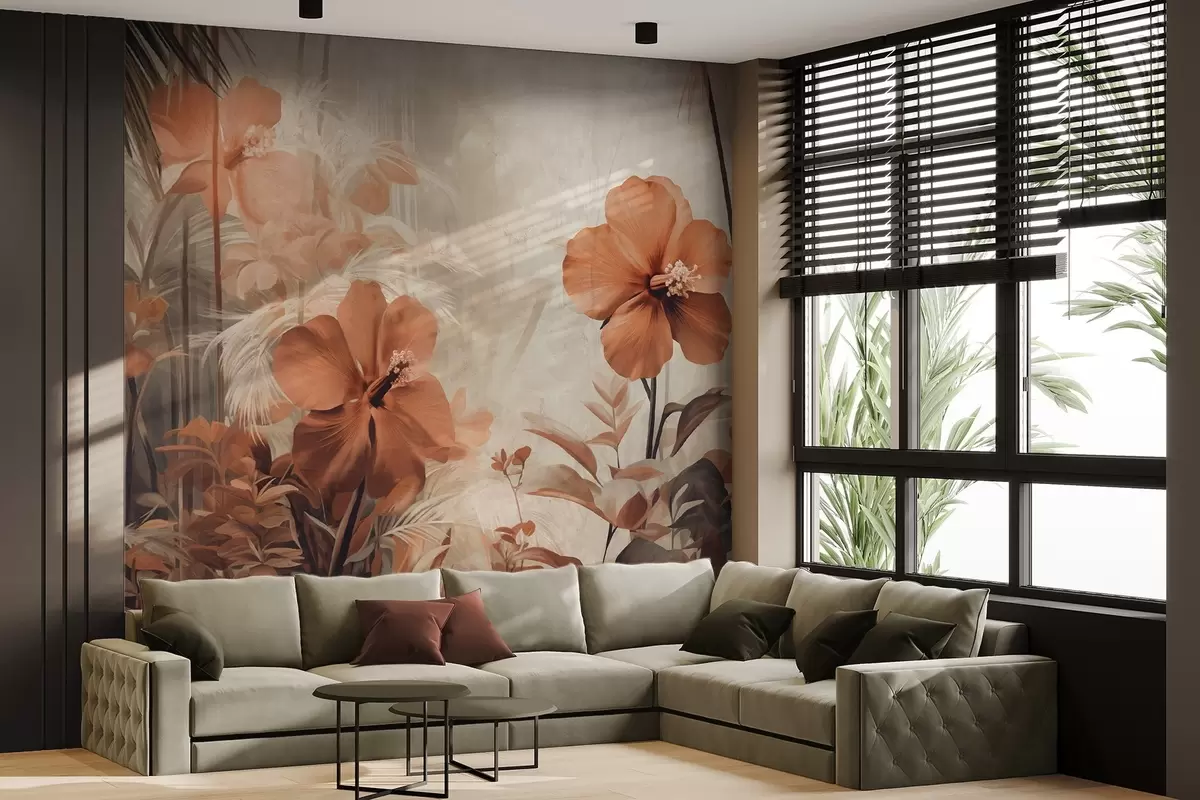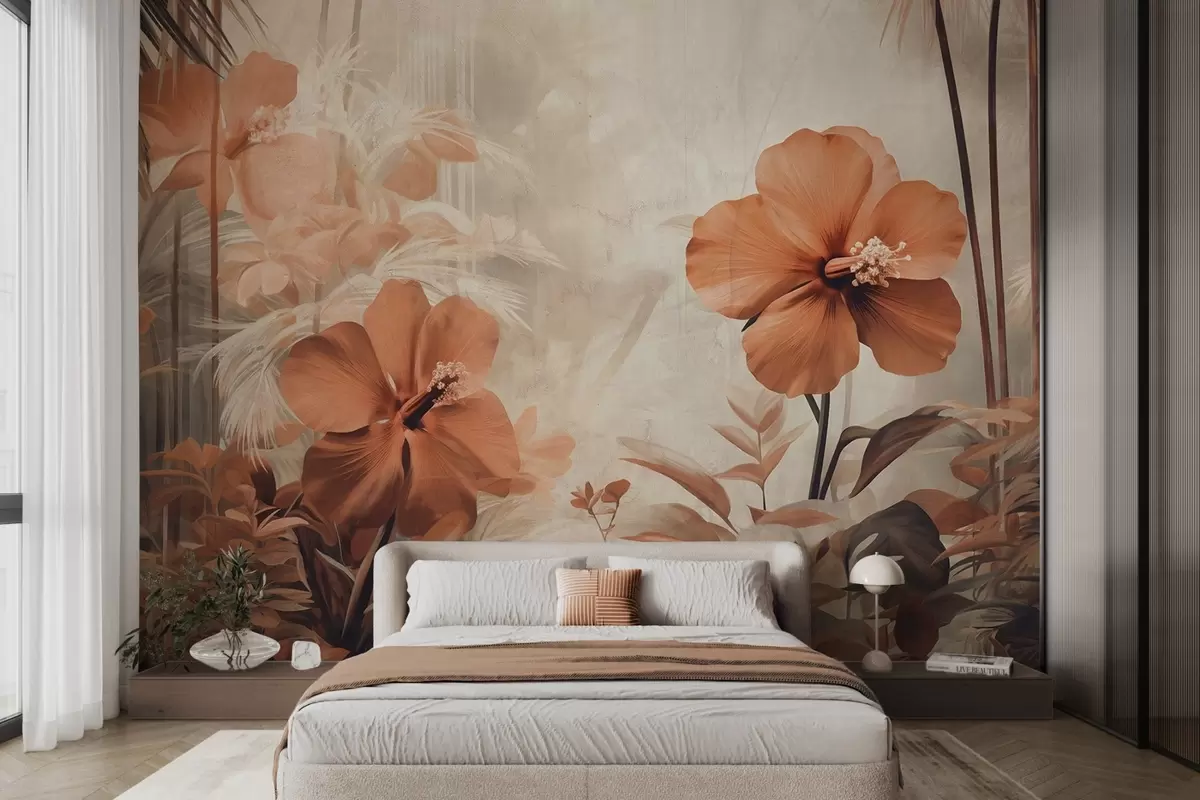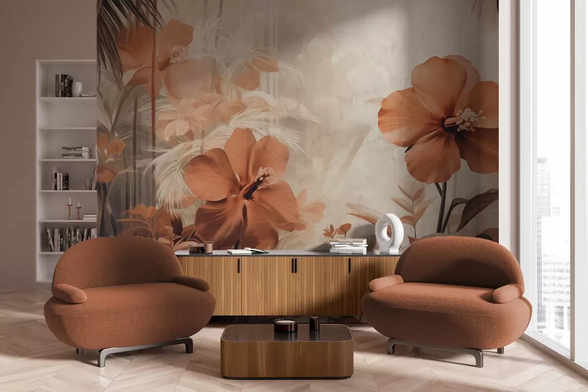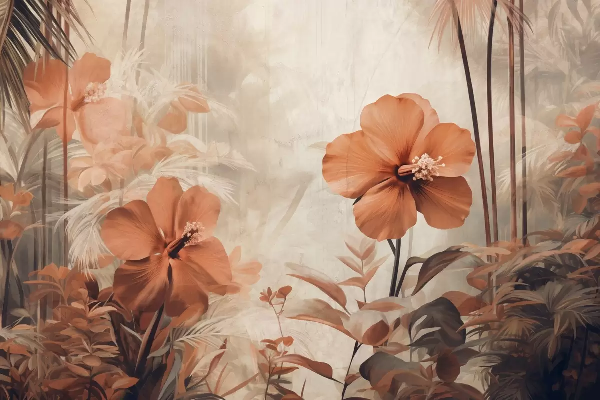 Fototapeedid Pastellpunased hibiskuslilled lehtede ja varrega, troopiline taimestik, pehmed, vaoshoitud värvid, vintage stiilis Nr w09203