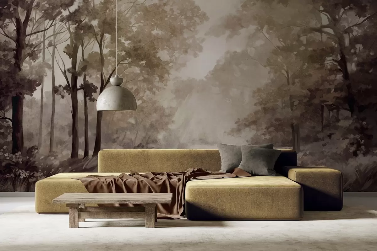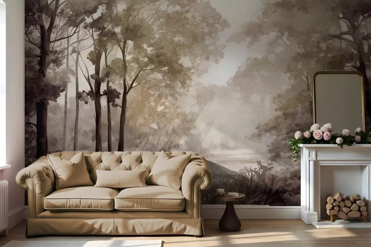 Fototapeedid Tekstuurne metsamaastik, beežide ja pruunide lehtedega puud, pastelne värvipalett Nr w09210
