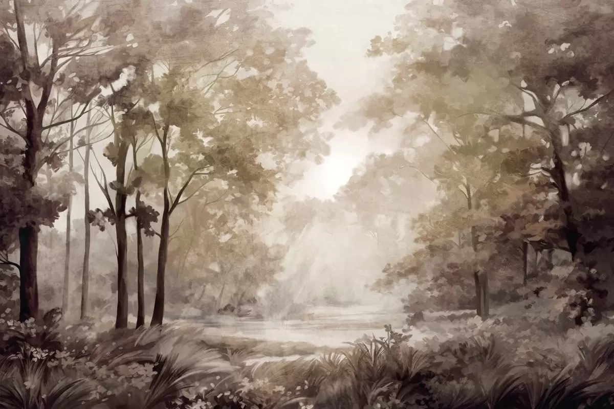 Fototapeedid Tekstuurne metsamaastik, beežide ja pruunide lehtedega puud, pastelne värvipalett Nr w09210