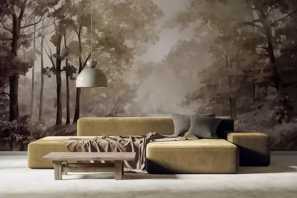Fototapeedid Tekstuurne metsamaastik, beežide ja pruunide lehtedega puud, pastelne värvipalett Nr w09210