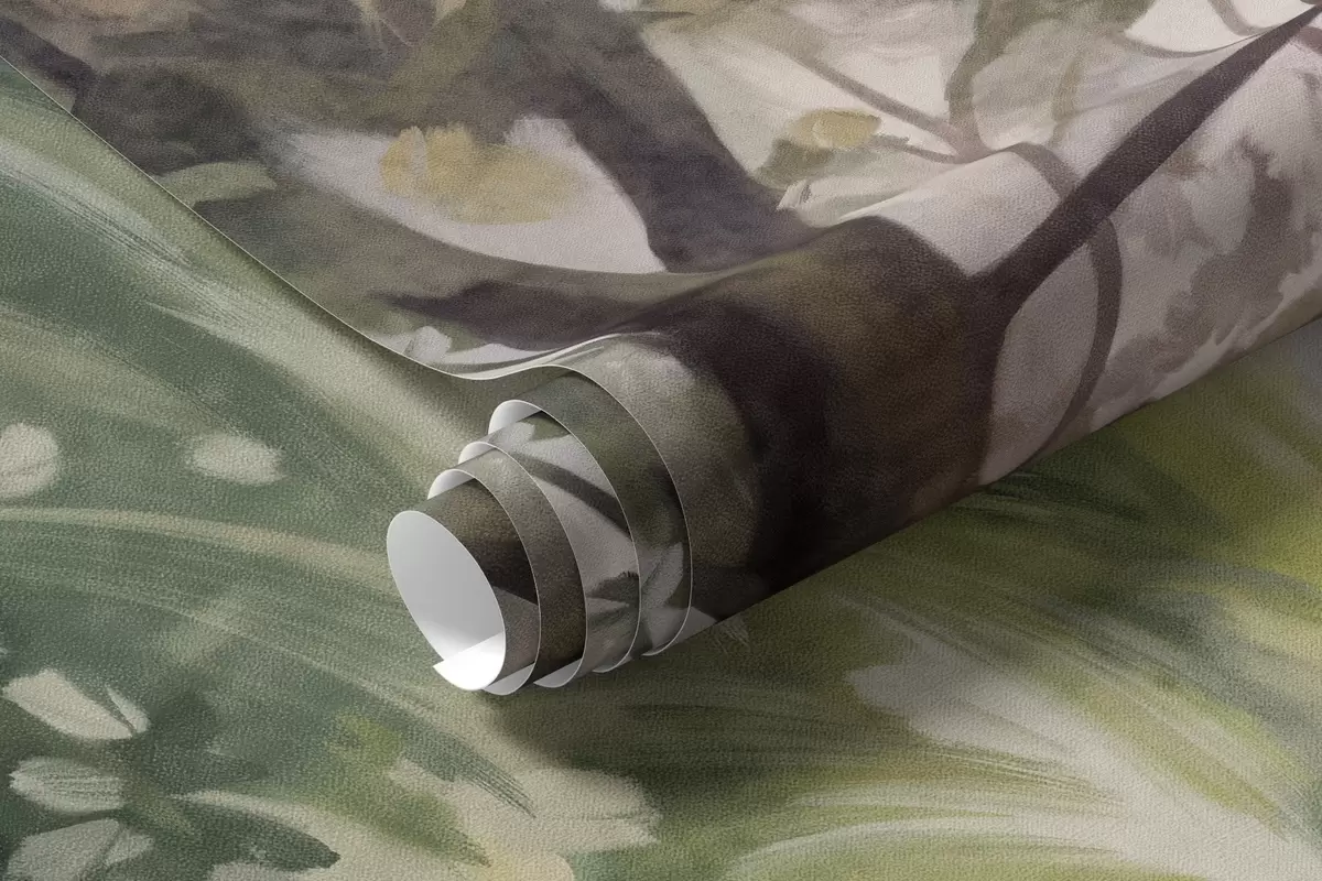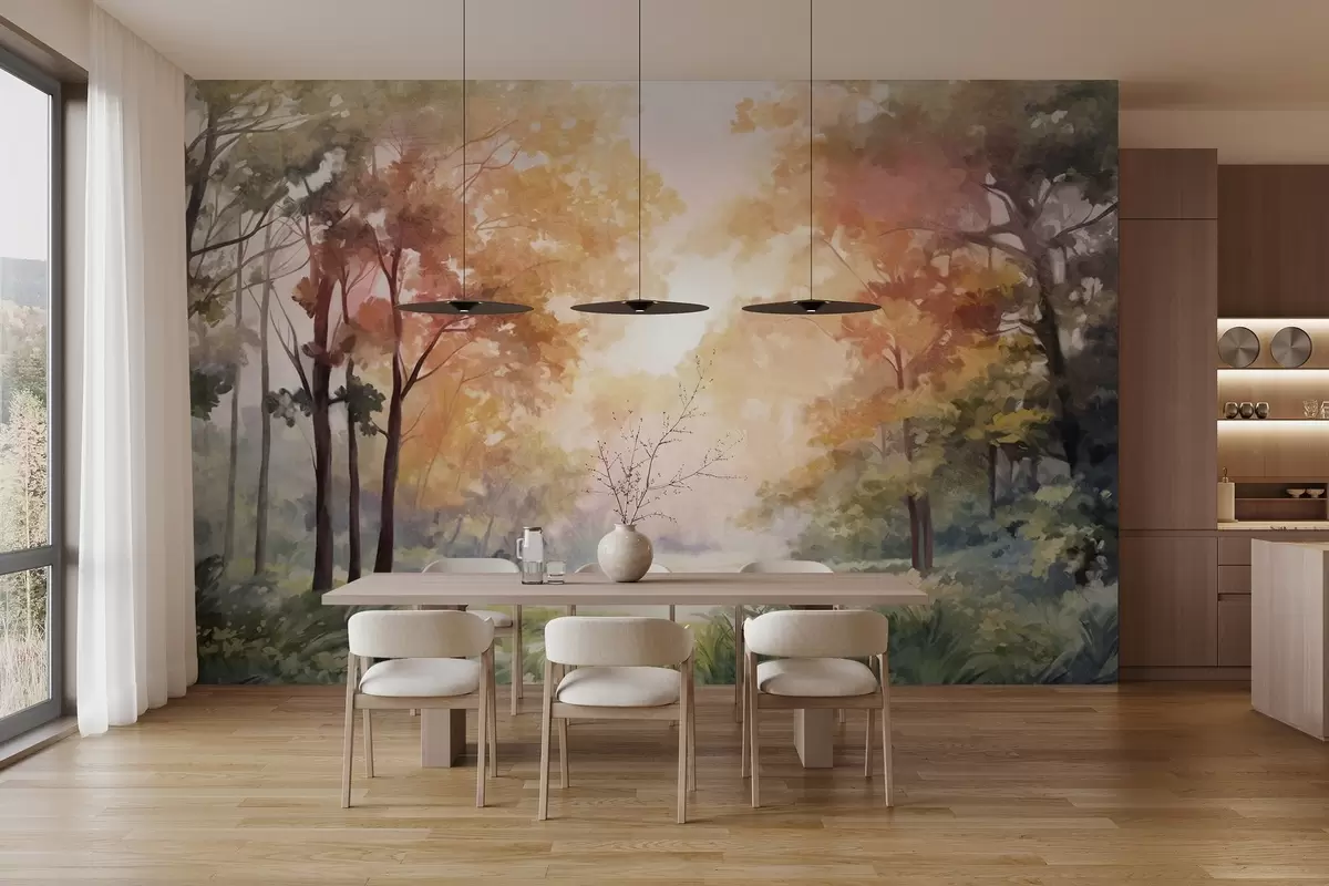 Fototapeedid Tekstuurne metsamaastik, oranžide ja roheliste lehtedega puud, pastelne värvipalett Nr w09210v1