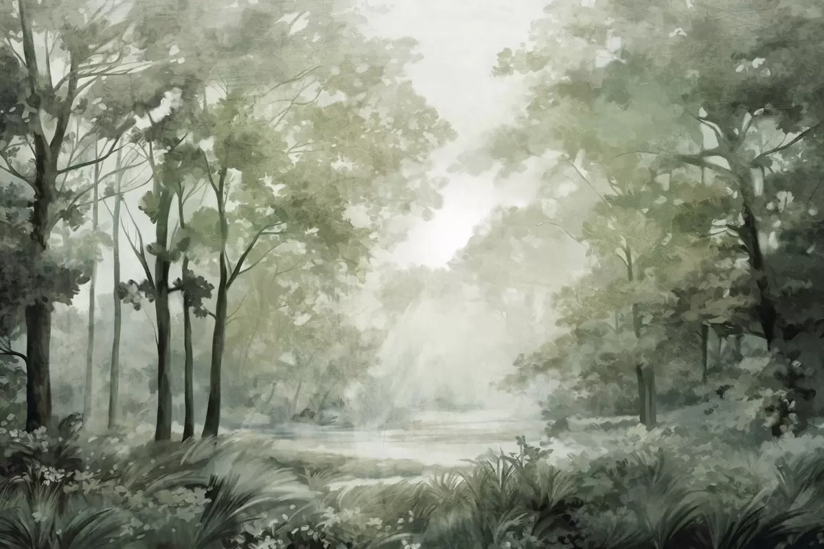 Fototapeedid Tekstuurne metsamaastik, roheliste lehtedega puud, pastelne värvipalett Nr w09210v2