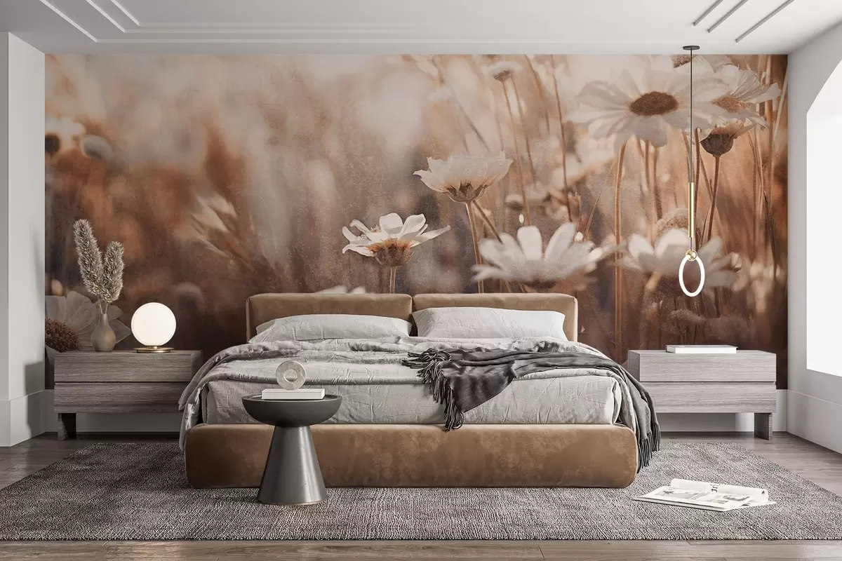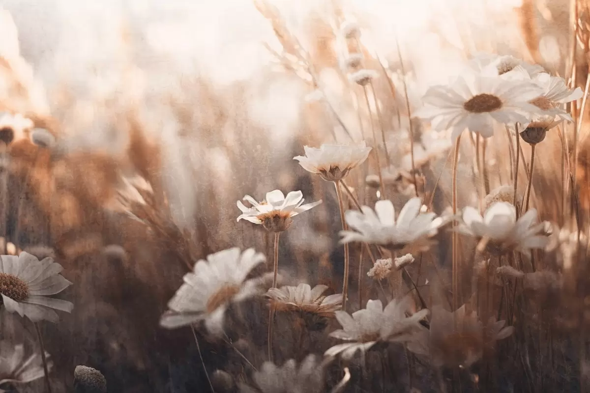 Fototapeedid Tekstuurne väli valgeid päevakesi ja metsalilli soojas värvipaletis, mille taust on hägune Nr w09214