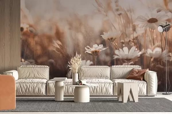 Fototapeedid Tekstuurne väli valgeid päevakesi ja metsalilli soojas värvipaletis, mille taust on hägune w09214