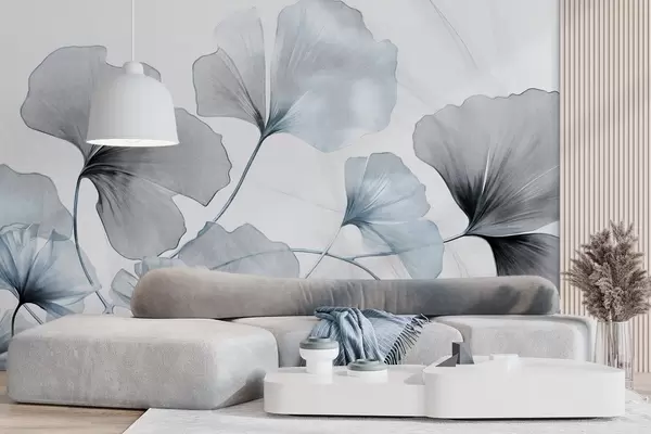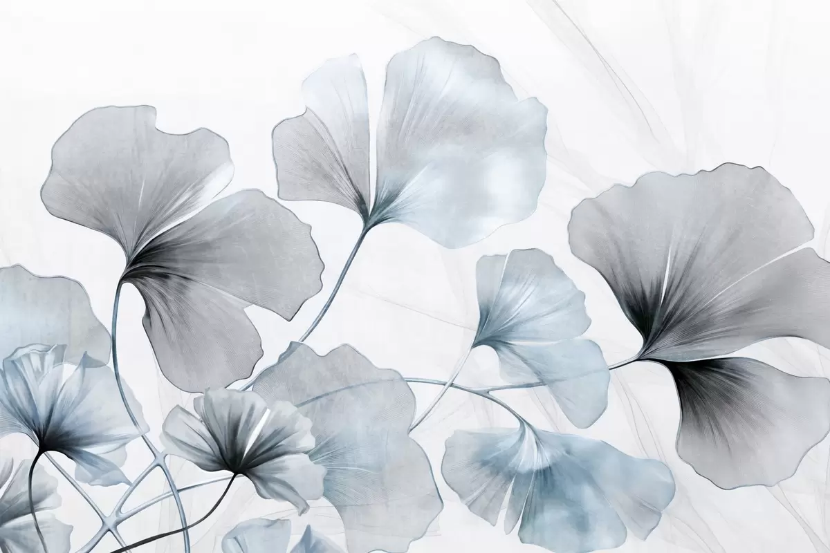 Fototapeedid Ginkgo biloba lehed vaoshoitud sinistes ja hallides toonides, õrna tekstuuriga akvarelli efekt, kerge taustaga Nr w09215v1