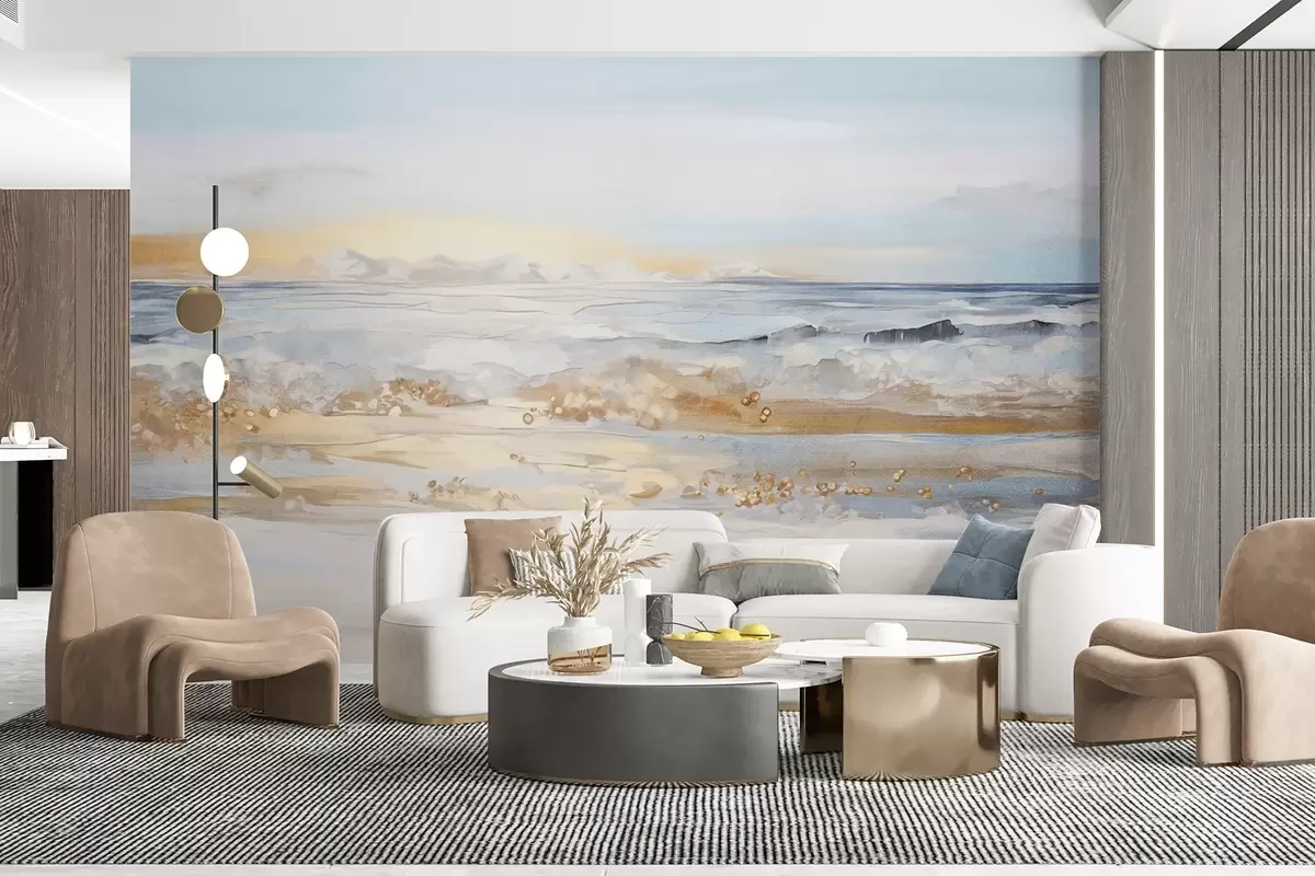 Fototapeedid Abstraktne tekstuurne maastik ookeanilained põrkuvad liivarannal, pehmed pastelsed värvid, sinine taevas koos kergete pilvedega Nr w09234