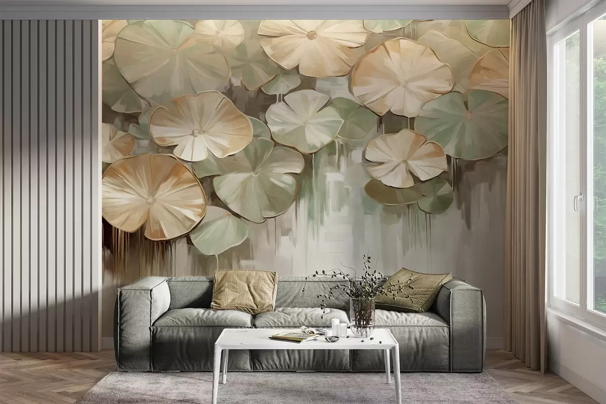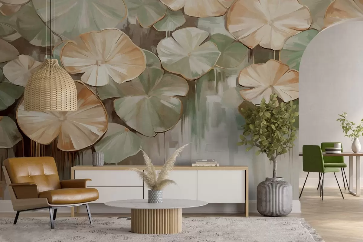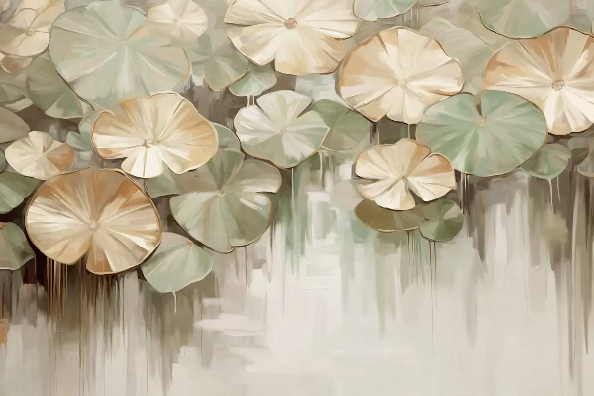 Fototapeedid Roheliste ja beežide värvidega tekstureeritud lillad tiigis, taustal on valge, rohelise ja pruuni värvi hägune segu Nr w09255