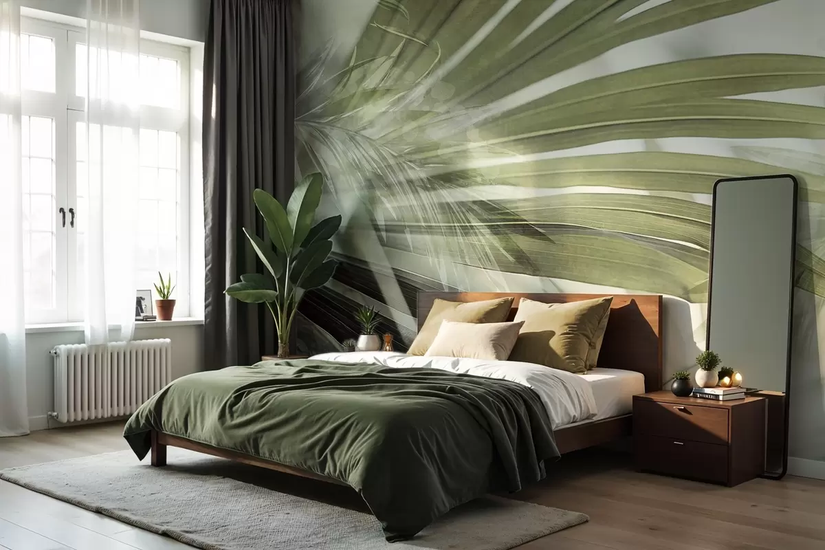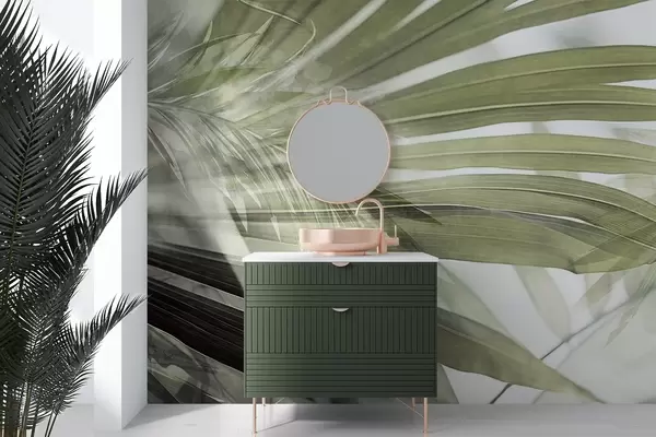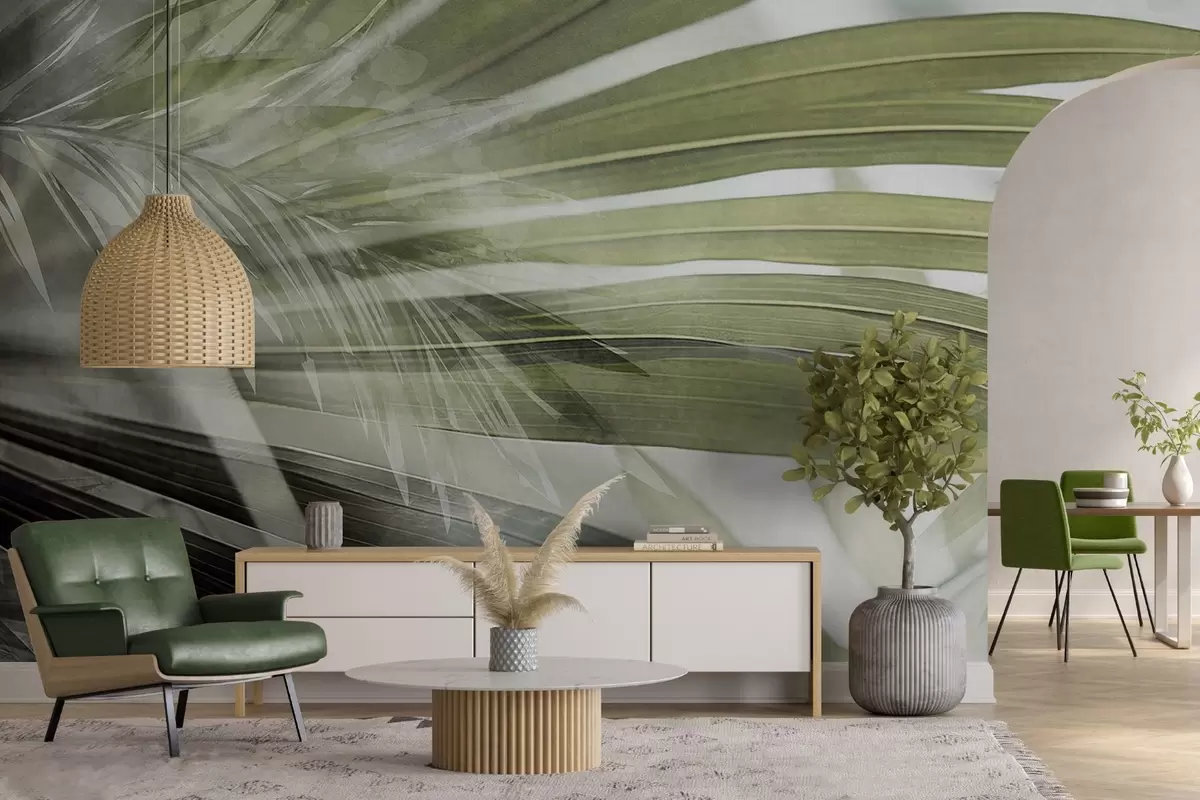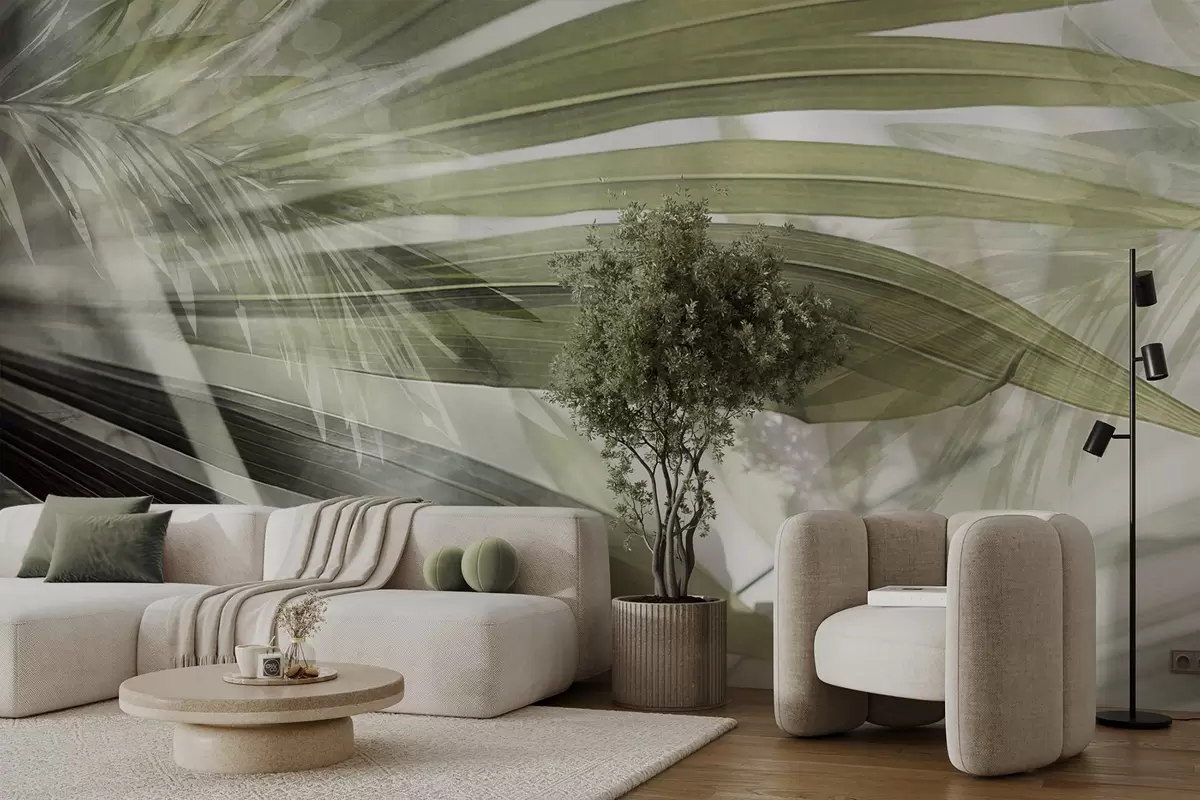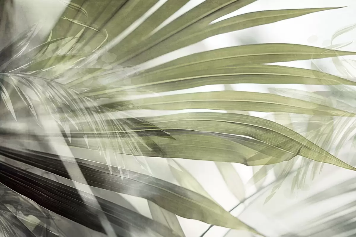 Fototapeedid Helerohelise tooniga palmilehed, mis kattuvad ja loovad kihilise efekti pehme, neutraalse tausta taustal Nr w09256v1