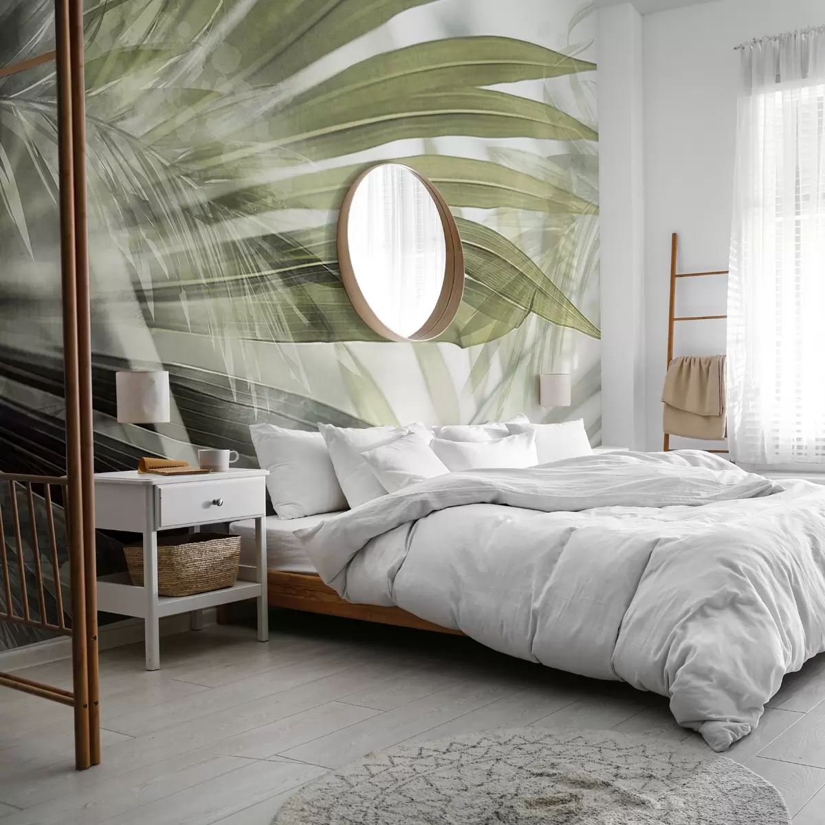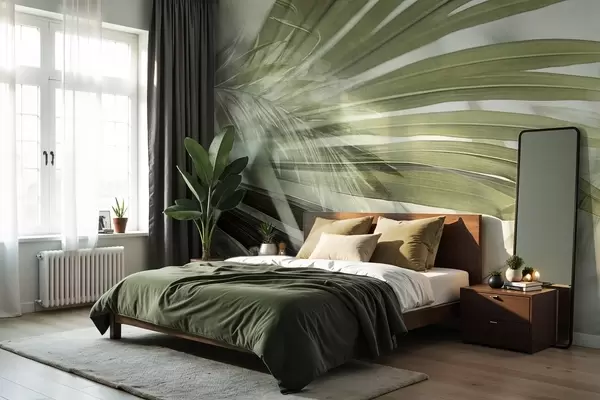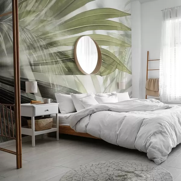 Fototapeedid Helerohelise tooniga palmilehed, mis kattuvad ja loovad kihilise efekti pehme, neutraalse tausta taustal Nr w09256v1