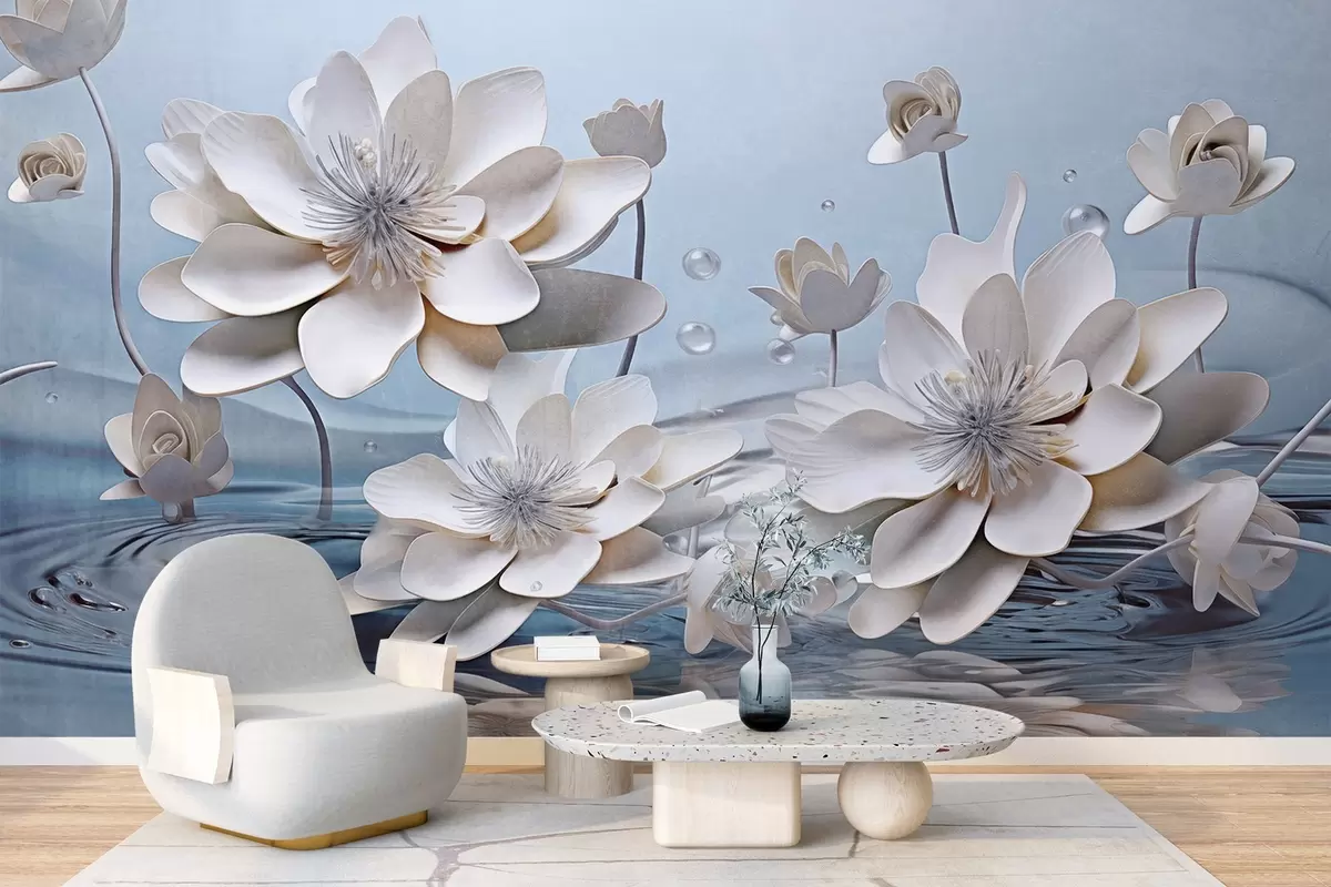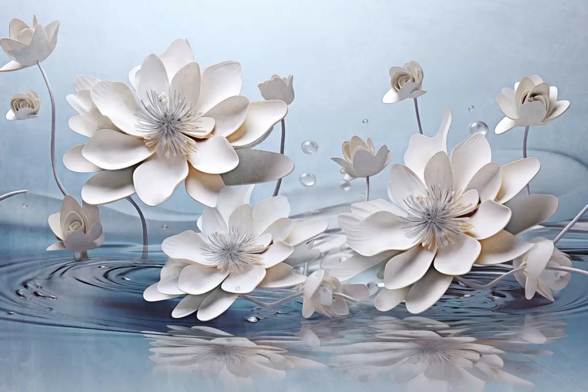 Fototapeedid Valge tekstuuriga lilled koos veetilkadega, peegeldused veepinnal, helesinine taust, elegantne kujundus Nr w09262