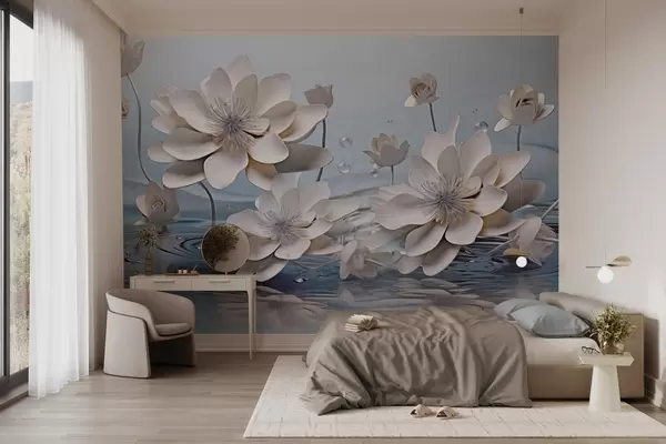 Fototapeedid Valge tekstuuriga lilled koos veetilkadega, peegeldused veepinnal, helesinine taust, elegantne kujundus Nr w09262