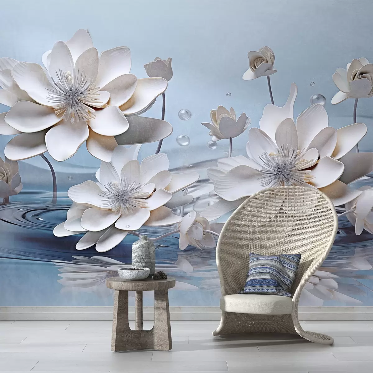 Fototapeedid Valge tekstuuriga lilled koos veetilkadega, peegeldused veepinnal, helesinine taust, elegantne kujundus Nr w09262