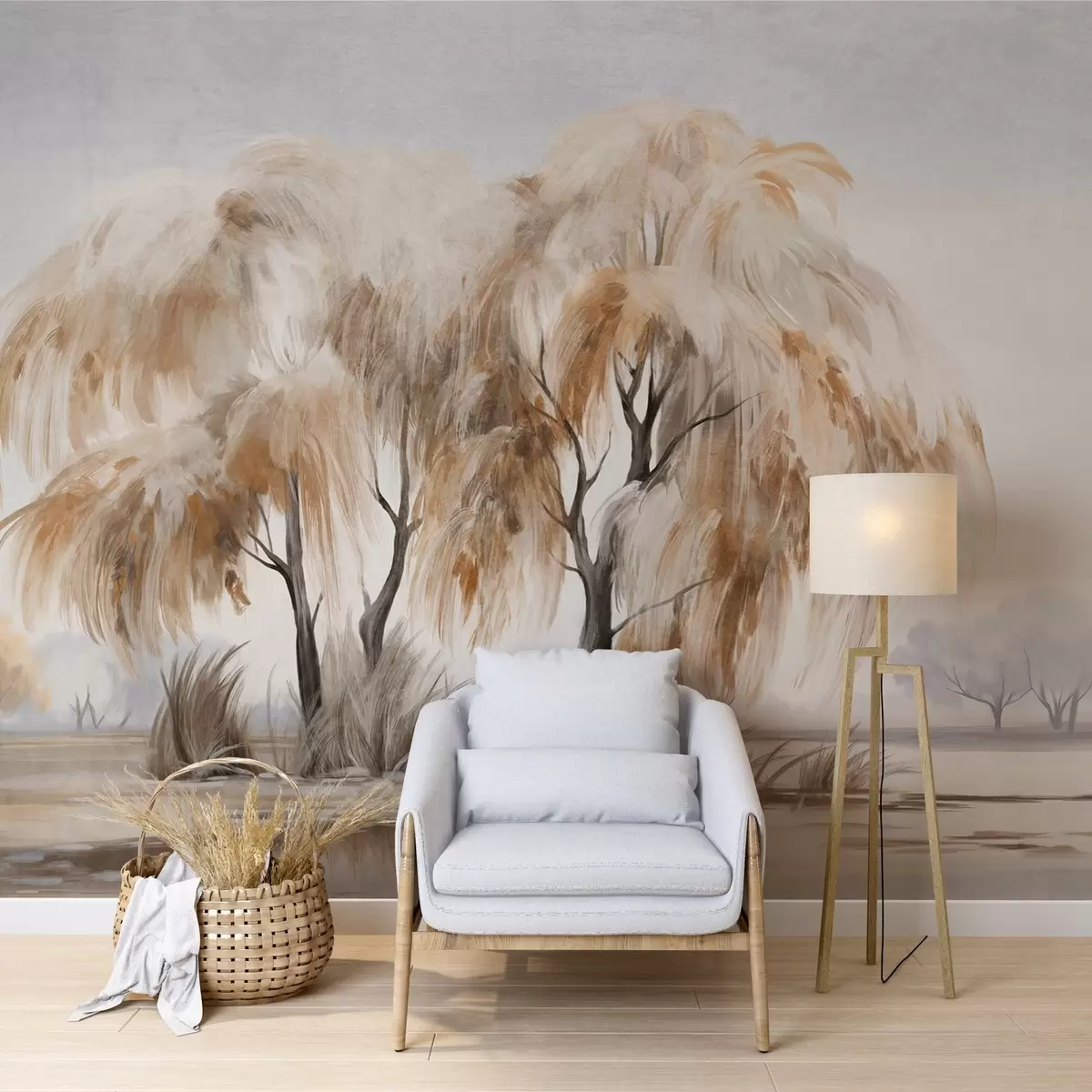 Fototapeedid Pruunide ja valgete lehtedega tekstuursed pajupuud järve kaldal, nende ümber on veidi rohtu, udusel päeval Nr w09268
