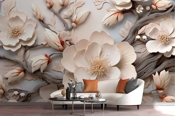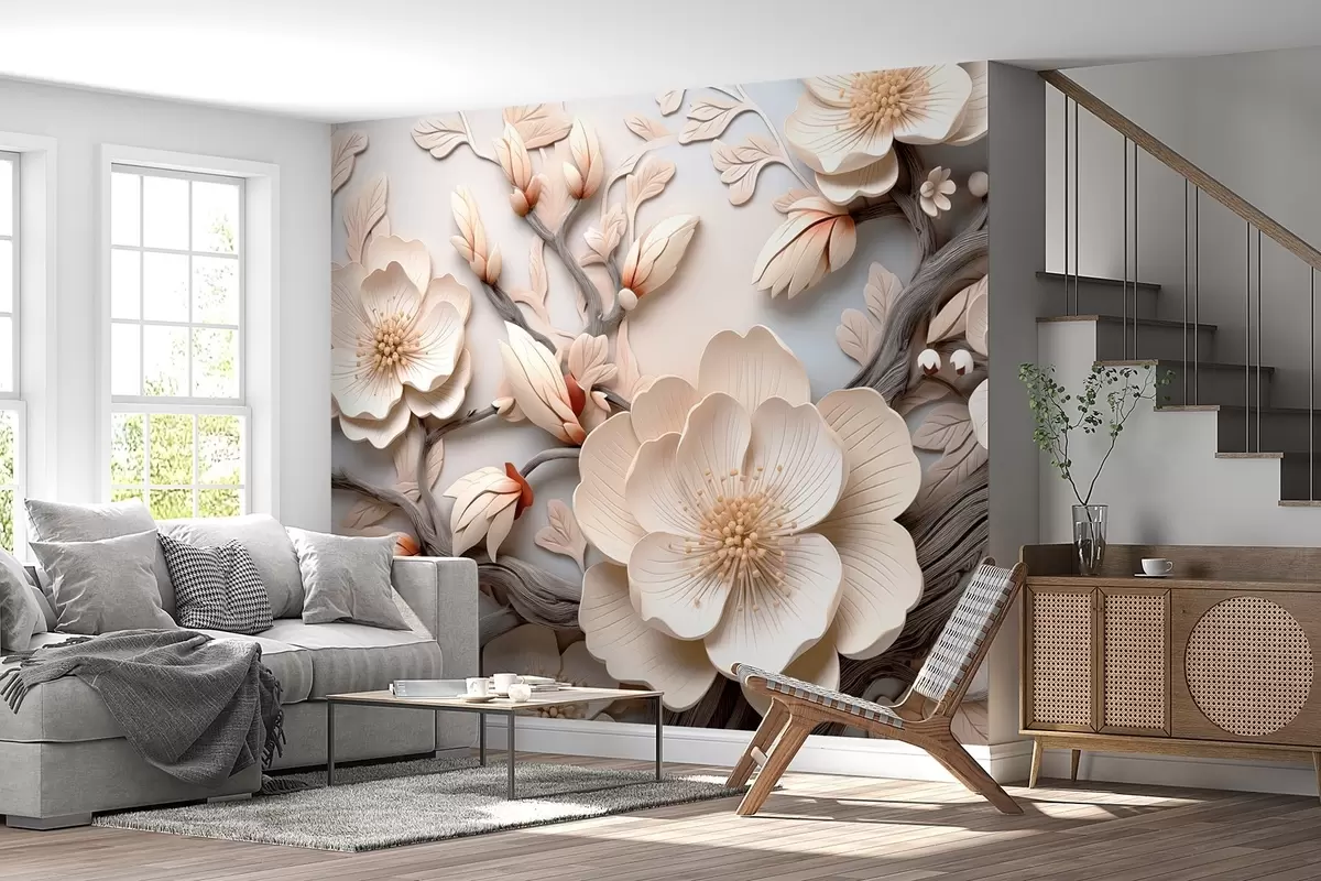 Fototapeedid Volüümilised lilled ja oksad heledates toonides Nr w09272