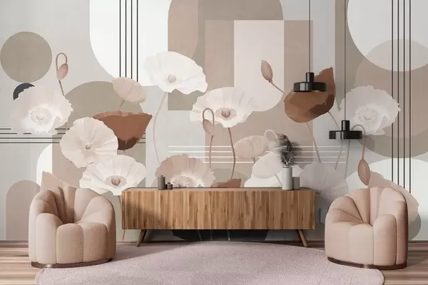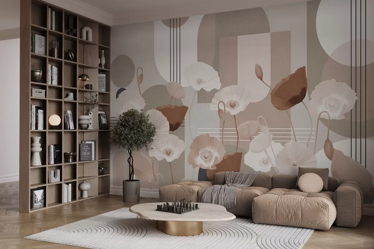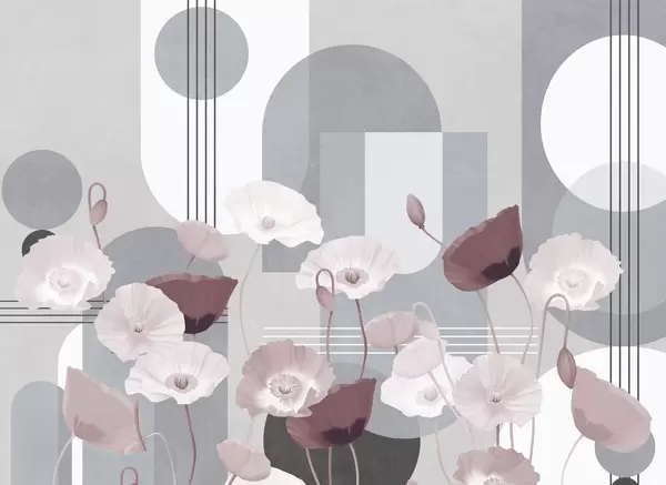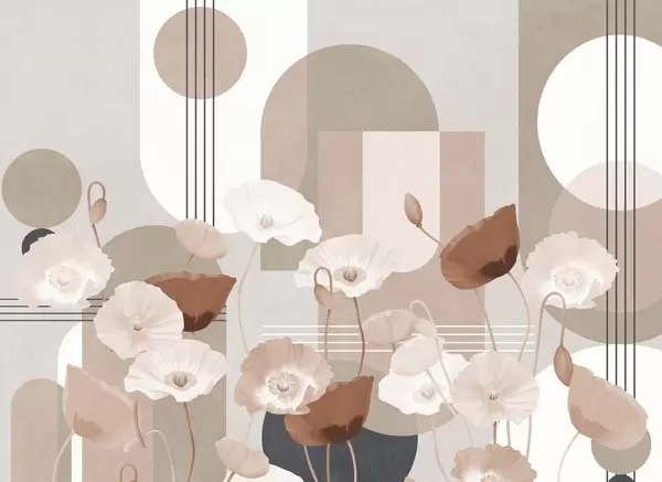 Fototapeedid Valge ja beeži värvi moonid geomeetriliste kujunditega taustal, ringid ja kaared, minimalistlik stiil, pehmed värvid Nr w09289