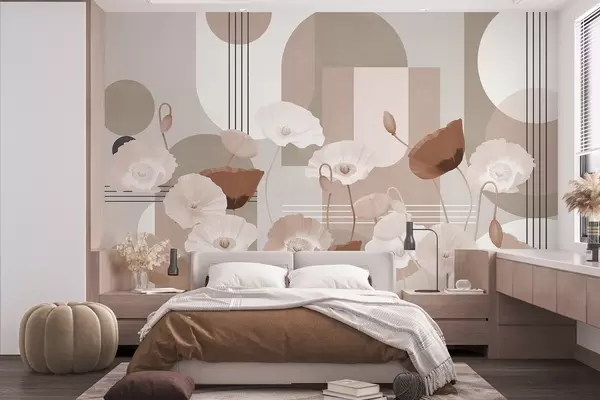 Fototapeedid Valge ja beeži värvi moonid geomeetriliste kujunditega taustal, ringid ja kaared, minimalistlik stiil, pehmed värvid Nr w09289