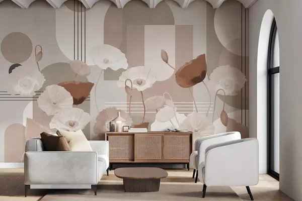Fototapeedid Valge ja beeži värvi moonid geomeetriliste kujunditega taustal, ringid ja kaared, minimalistlik stiil, pehmed värvid Nr w09289
