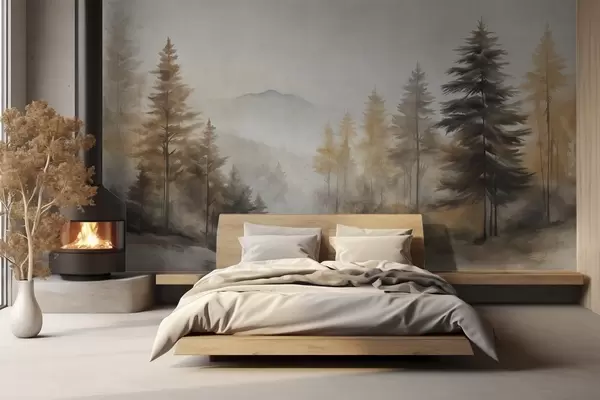 Fototapeedid Tekstuurne sügismets koos kõrgete mändide ja mägedega taustal, värvid on vaoshoitud ja mahedad maalimisstiilis Nr w09290
