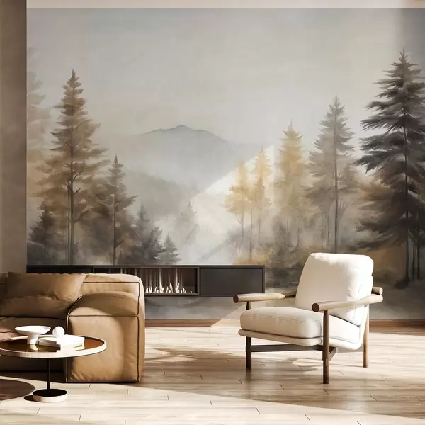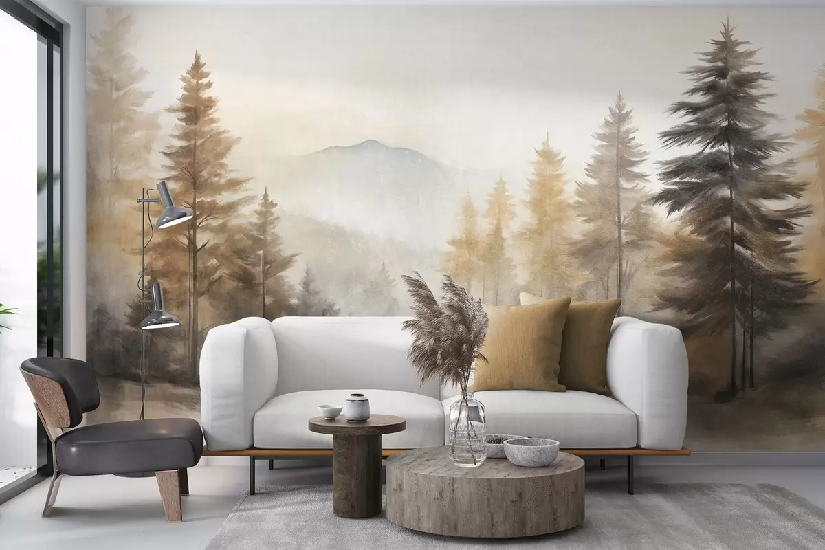 Fototapeedid Tekstuurne sügismets koos kõrgete mändide ja mägedega taustal, värvid on vaoshoitud ja mahedad maalimisstiilis Nr w09290