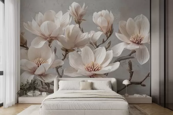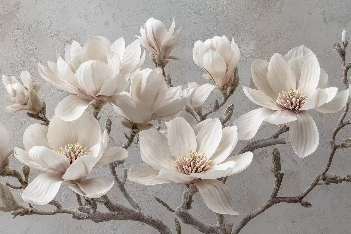 Fototapeedid Magnoolia oksad suurte heledate lilledega summutatud toonides Nr w09305