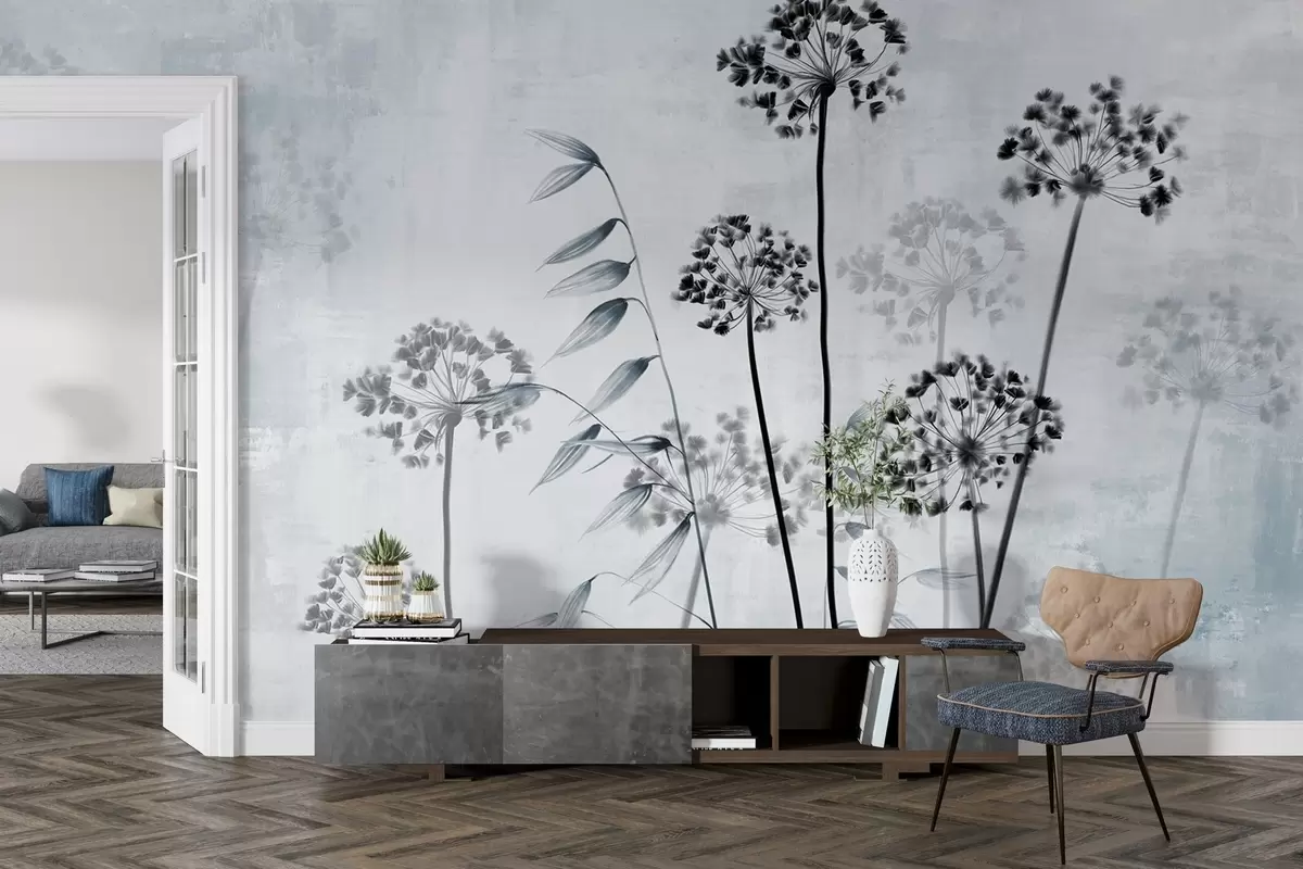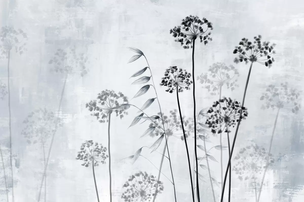Fototapeedid Kuivatatud lillede joonistus pikkade varrega, ühevärviline palett, tekstuursel, helehallil taustal, botaaniline illustratsioon Nr w09314