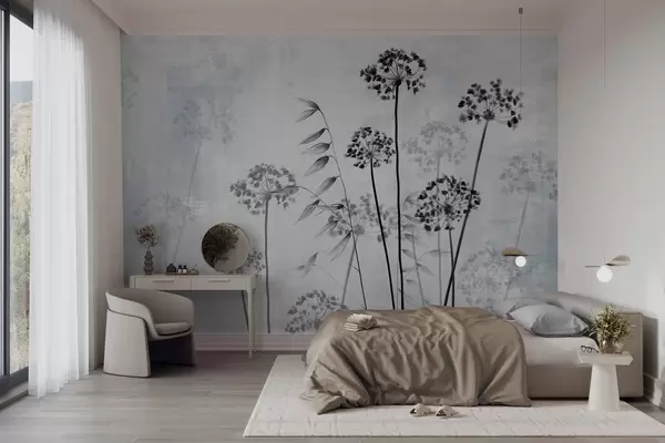 Fototapeedid Kuivatatud lillede joonistus pikkade varrega, ühevärviline palett, tekstuursel, helehallil taustal, botaaniline illustratsioon Nr w09314