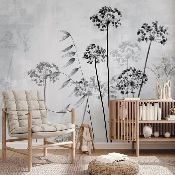 Fototapeedid Kuivatatud lillede joonistus pikkade varrega, ühevärviline palett, tekstuursel, helehallil taustal, botaaniline illustratsioon Nr w09314