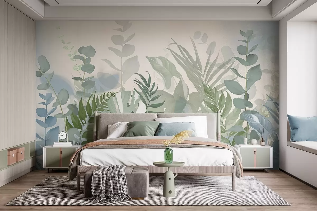 Fototapeedid Pastellrohelised taimed sõnajalad, monstera ja eukalüpt, kerge tekstuuriga taust, pehme valgustus, rahulik , botaaniline illustratsioon Nr w09316