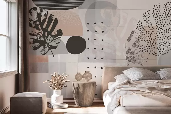 Fototapeedid Geomeetriliste kujundite ja monstera troopiliste lehtede, ringide, punktide ja joontega abstraktne trükis, kaasaegne ja minimalistlik disain Nr w09333